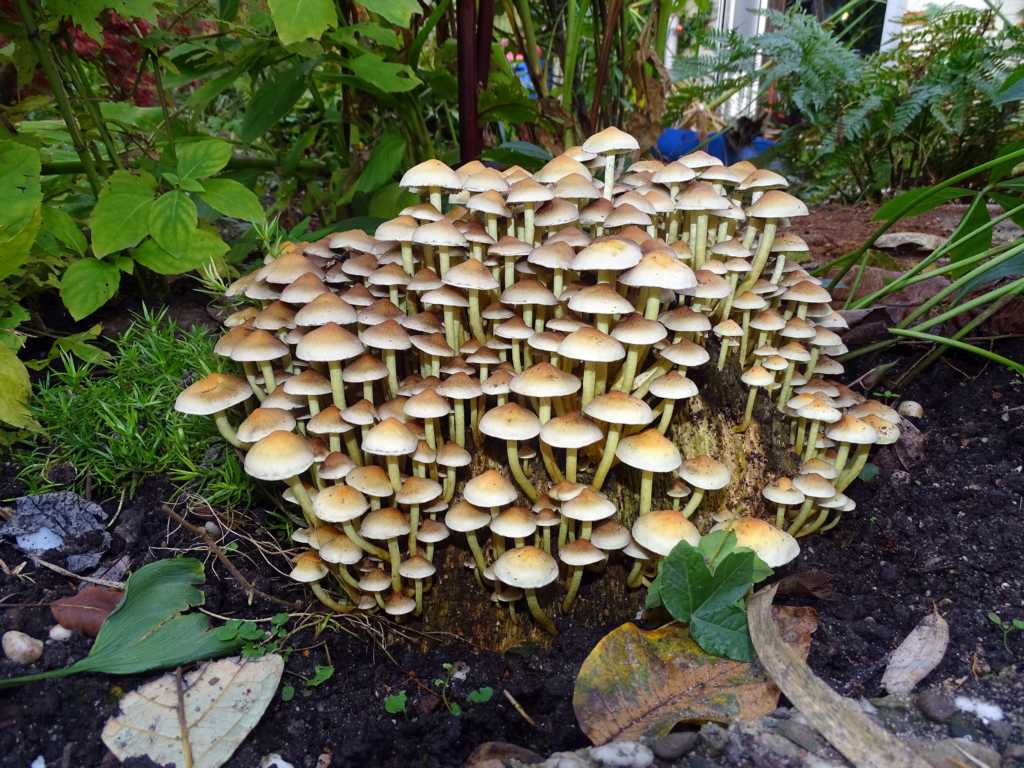 Zur Zeit wachsen im Garten auf Stümpfen ehemaliger Fichten wieder Pilze. Ich möchte sie mal als Stockschwämmchen bezeichnen. Vielleicht weiß eine(r) im Forum Genaueres. Ich beute sie nur fotografisch aus, da ich annehme, dass sie zur größten Gruppe der Pilze gehören: als Speisepilze wertlos!