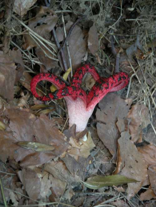 Einen Pilz aus dem Mittelmeergebiet findet man jetzt auch bei uns in den Wäldern, den Tintenfischpilz (Clathrus archeri). Er gehört zu den Gitterlingen, die zu den Rutenpilzartigen gerechnet werden, zu denen auch die häufige Stinkmorchel gehört.