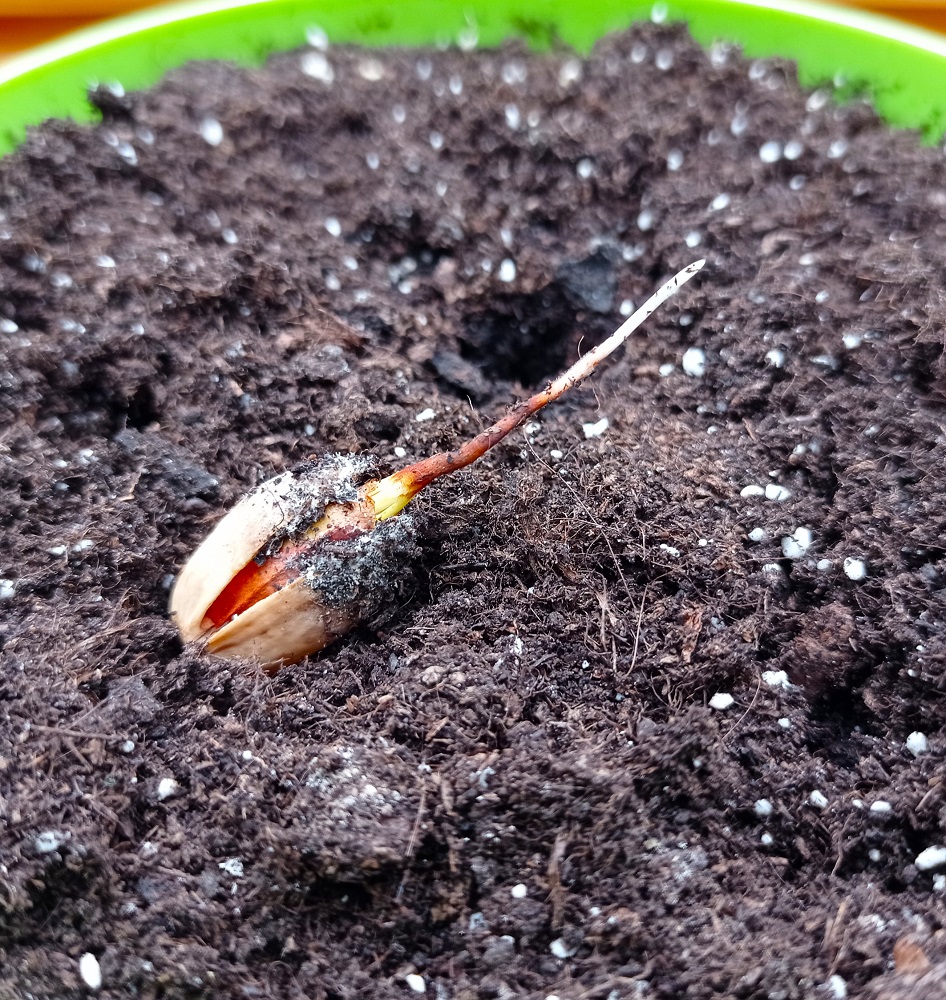 Hier die Entwicklung meiner Pistazie. Jetzt ziemlich genau 1 Woche alt seit der Keimung. Die Wurzel ist etwa 4 bis 5 cm lang.