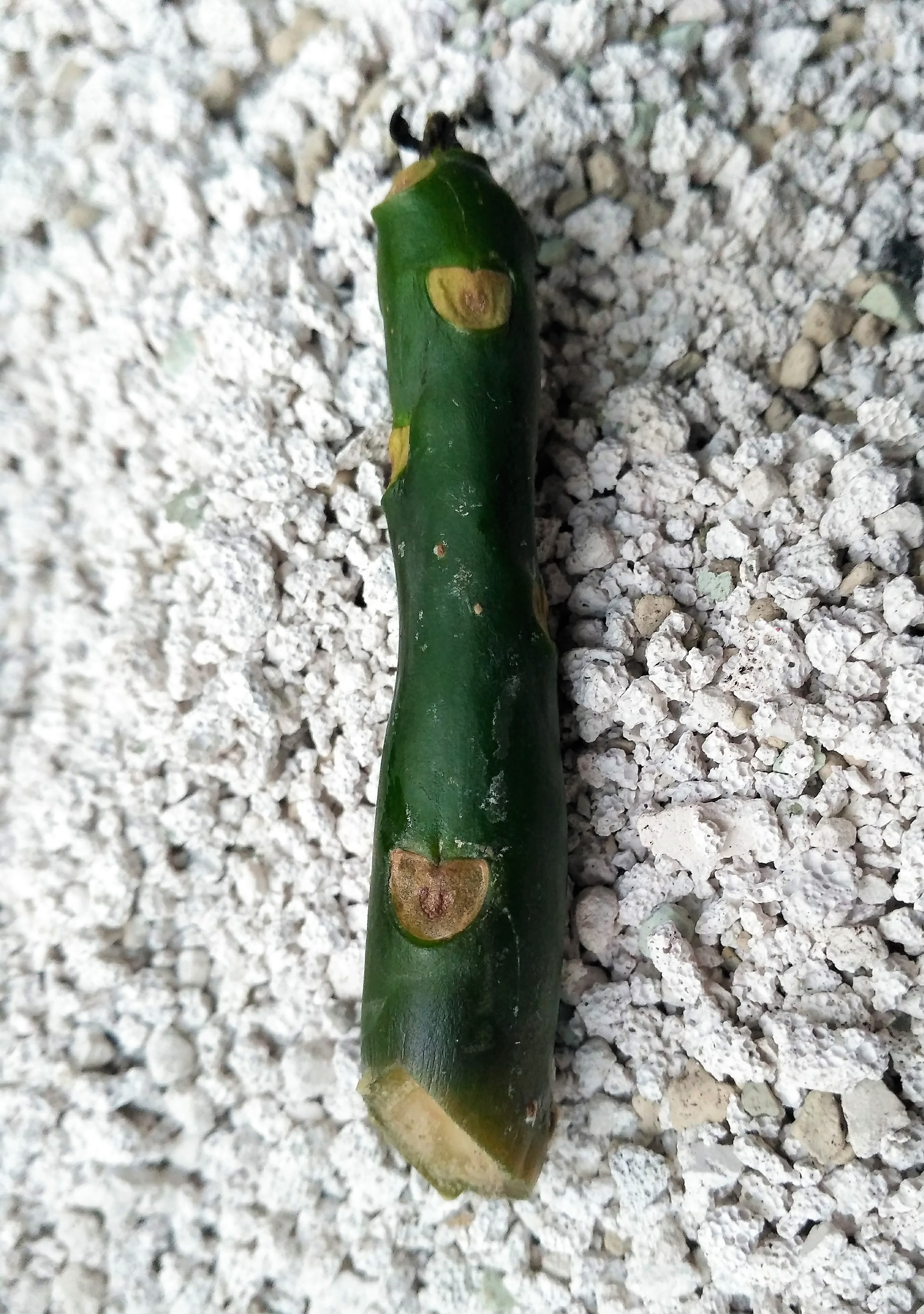 Der andere Steckling (der vom grünen Trieb) wurde weich und ist gefault. Das Gefaulte habe ich bis in den gesunden grünen Stamm abgeschnitten und zwei neue Stecklinge trocknen jetzt schon seit etwa 2-3 Wochen vor sich hin. Die Stecklinge sind jetzt zwar an der Schnittstelle hart und verholzt, der restliche Steckling ist inzwischen aber schrumpelig und auch noch immer drückbar (also nicht so verholzt, wie das Ende - aber auch nicht so weich, wie der faulende Stamm seinerzeit).