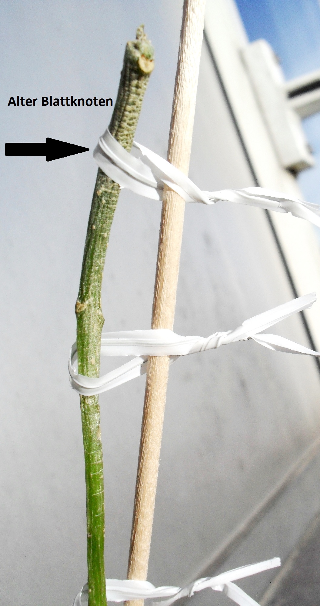 Jetzt wollte ich fragen, ob ich die Spitze bis zum nächsten alten Blattknoten zurückschneiden soll, damit vielleicht dort ein Blatt austreiben kann?