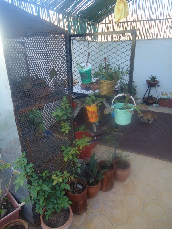 Ich habe das Heu, das Stroh, und das Streu, und alles, was sonst noch rumlag, locker in diese Säcke gestopft; meine Idee ist: ich könnte sie, falls es doch noch richtig kalt werden sollte, z. B. bei den Pflanzen, die in der Garage direkt am Fenster stehen, zwischen dieTöpfe stecken, so ein bißchen als zusätzliche Wärme-Isolierung. Oder sie in wirklich kalten Nächten direkt an der Scheibe stapeln, daß nicht so viel kalte Luft durchzieht. In dieser Form (in den Säcken) macht das wenig Dreck und das Ganze läßt sich schnell und problemlos wieder wegnehmen.