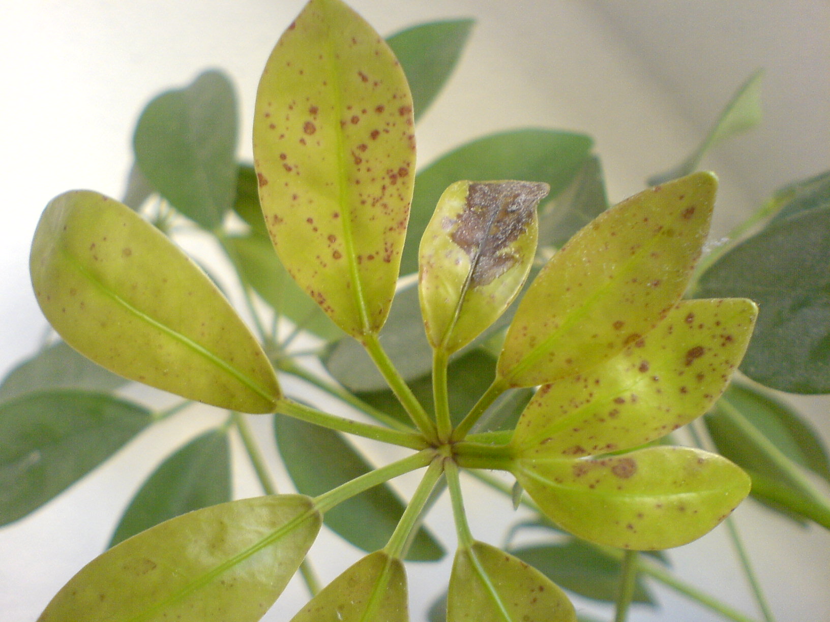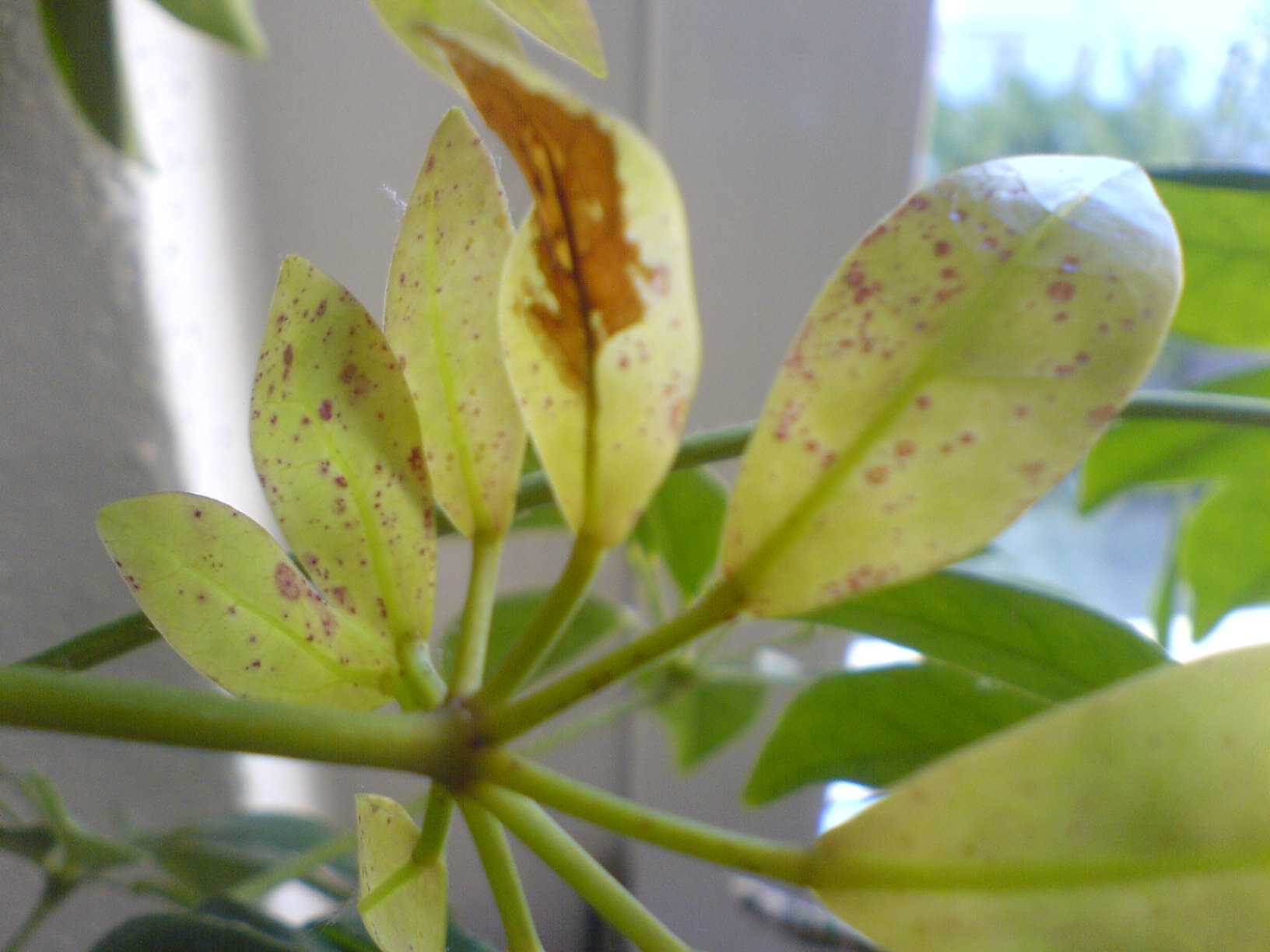 Nun zu meinem Problem. Ich bin gerade aus einem 3 wöchigen Urlaub zurückgekommen - meine fleißigen Mitbewohner haben sich um meine Pflanzen gekümmert. Denen gehts auch recht gut, nur leider meiner Finger-Aralie nicht. Sie ist jetzt schon fast 1,70m. Die meisten Blätter sind wunderbar dunkelgrün. Aber nicht die jüngsten Triebe. Diese sehen nämlich so, wie im Anhang aus.