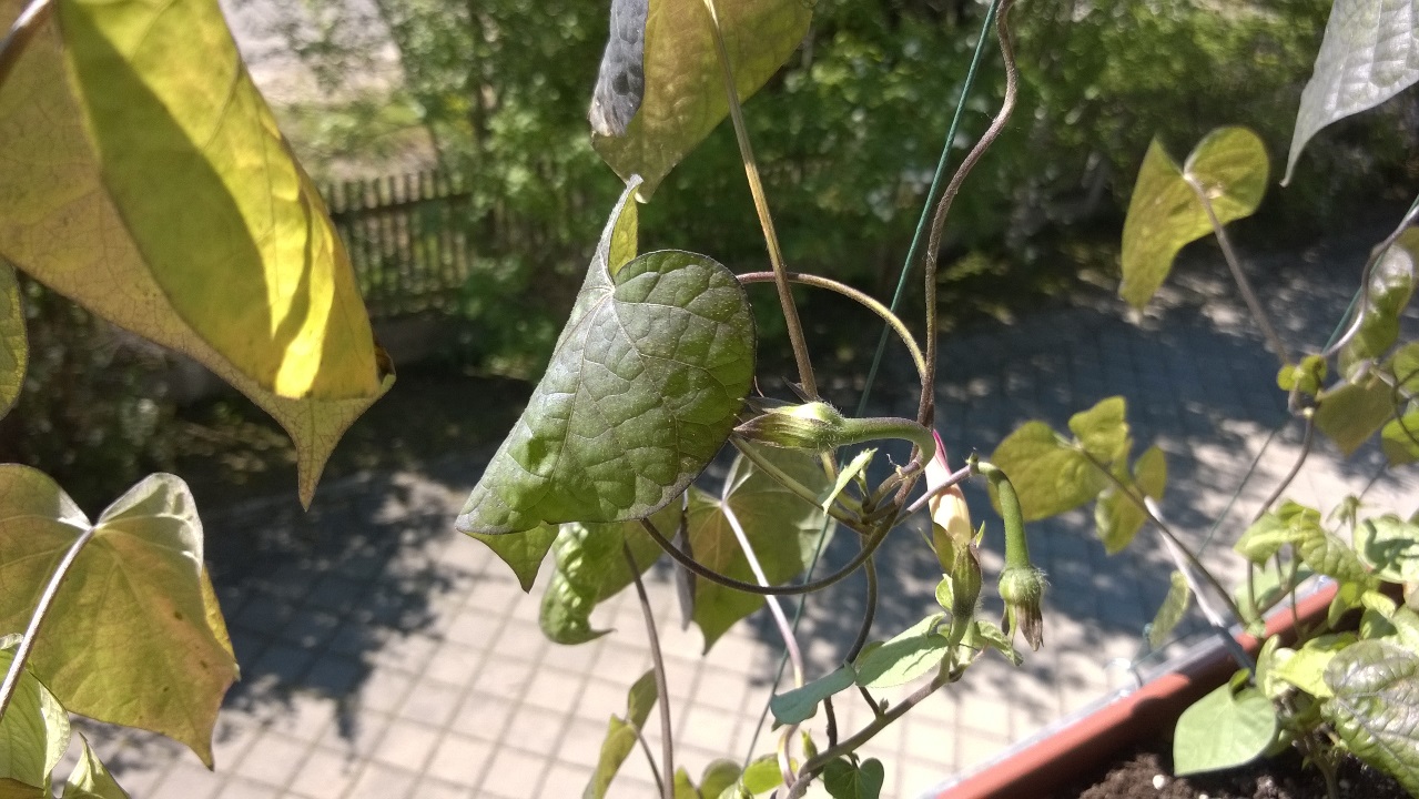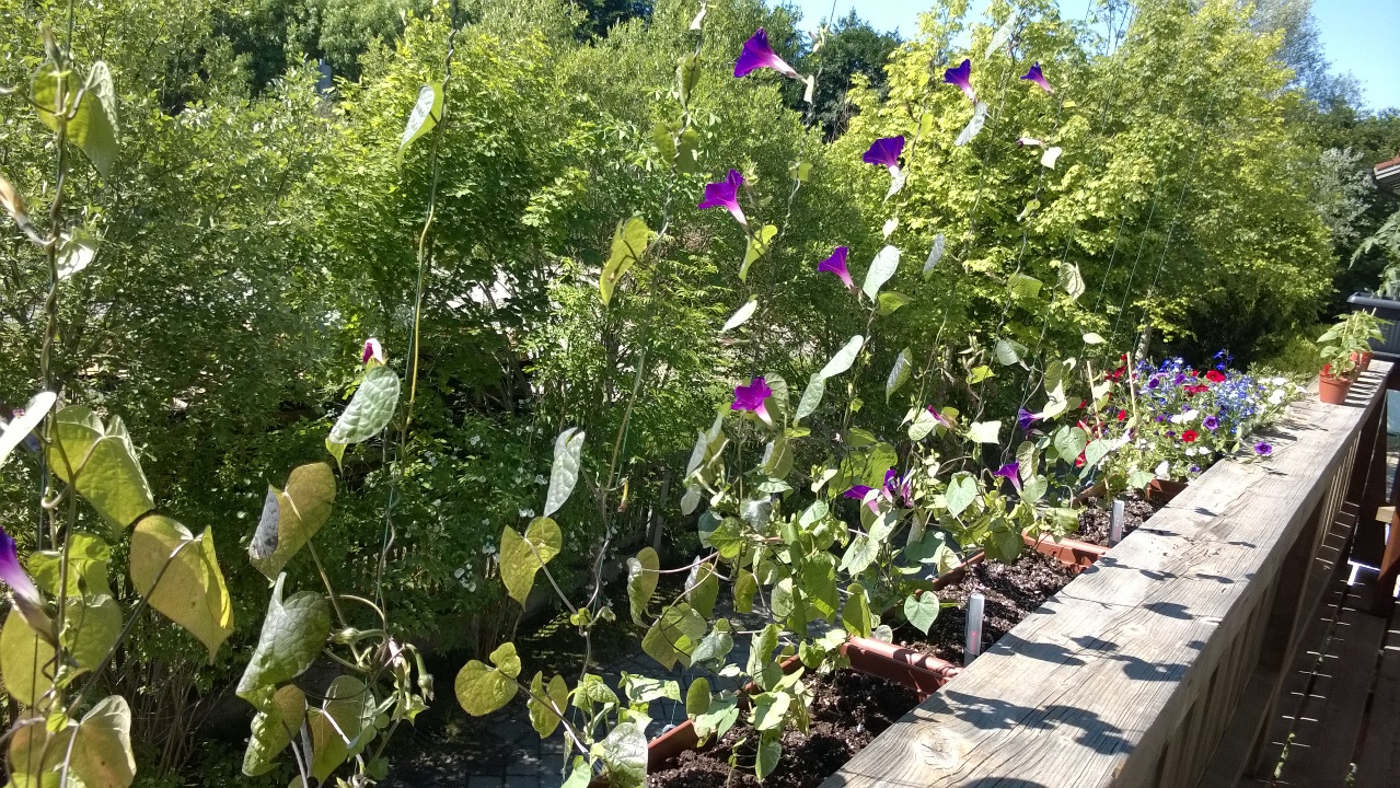 Ich habe dieses Jahr 12 Prunkwinden (laut Lieferant: Ipomea - Grandpa Otts) aus Samen gezogen um einen Sichtschutz auf meinem Balkon wachsen zu lassen. Dazu habe ich Drähte gespannt, an denen diese hochwachsen sollen. Die Erde ist Grünpflanzen- und Palmenerde eines bekannten Herstellers und die Pflänzchen sollen in Blumenkästen wachsen.