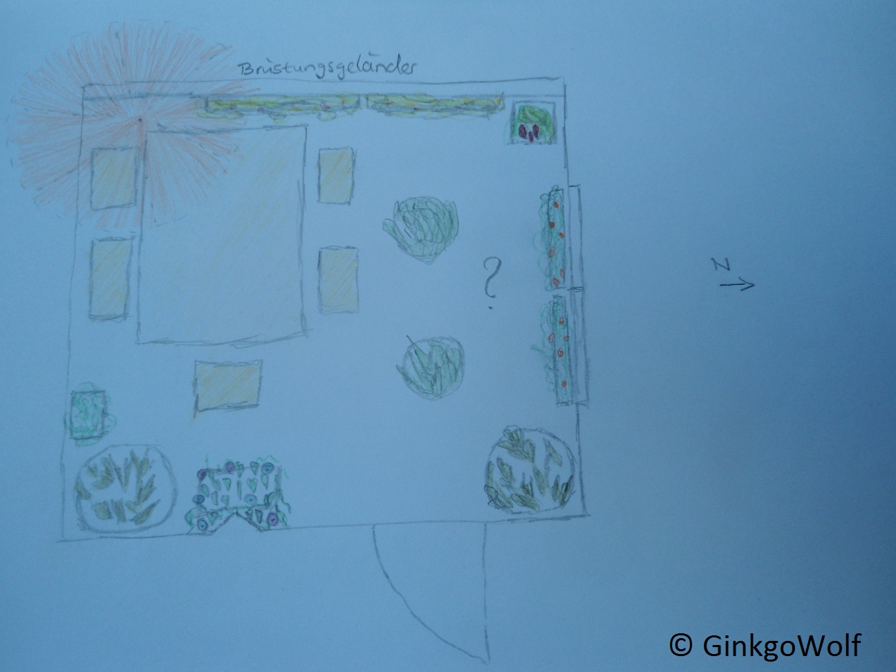 Ich hab deine Sitzgruppe mit Tisch und Schirm weiter in Richtung Norden geschoben und dadurch etwas Platz für Kübel und Kästen an der Südwand gewonnen. Vor deinem Fenster könnte ich mir ein paar Kästen mit niedrig wachsenden Kapu-Kressen (niedrige oder nicht rankende Mischung) oder Mini-Petunien oder so was vorstellen. Die werden auch nicht so hoch.