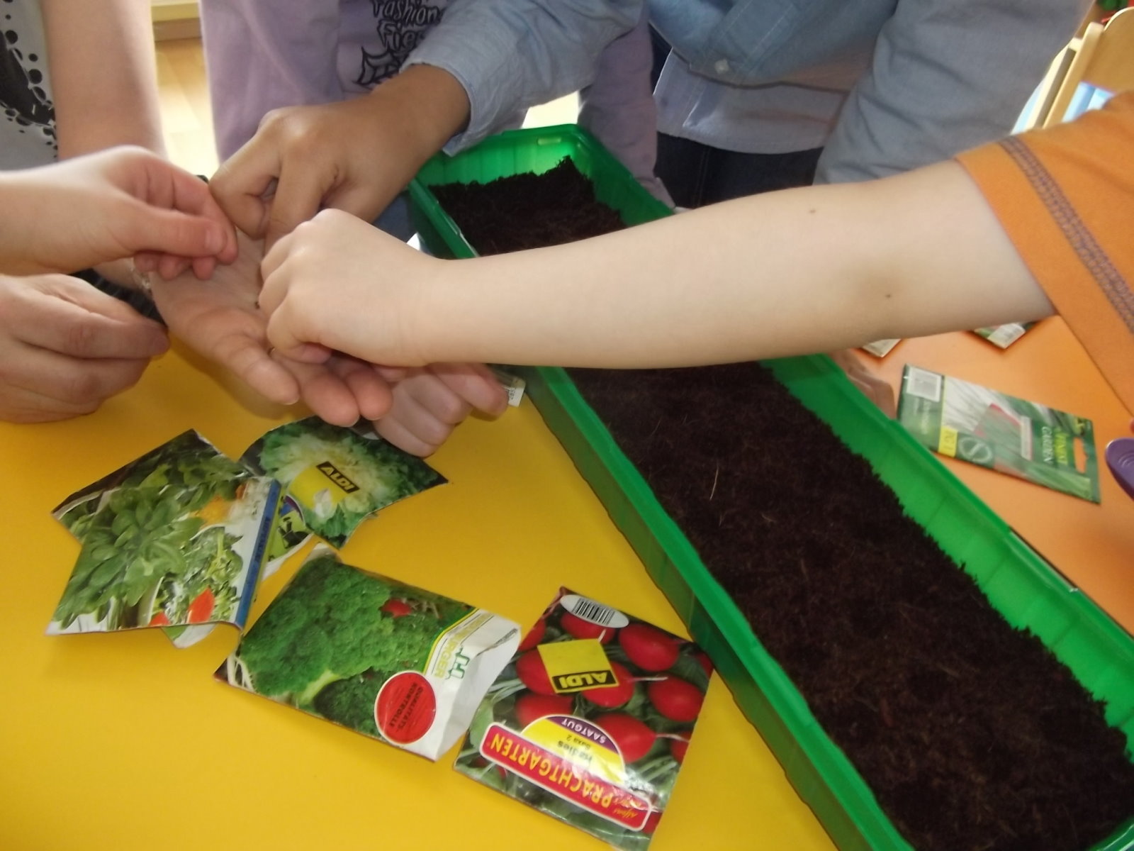 Anschliessend wurden auch hier die Pflanzlinien vorbereitet, den Kindern die Samentütchen gezeigt und erklärt.