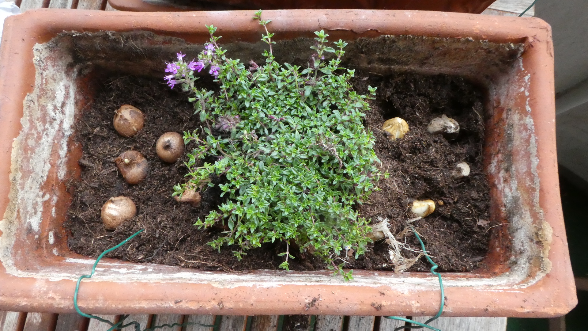 mein Balkon lässt leider nur sehr kleine Balkonkästen zu und jedes Jahr vertrocknen mir die Sommerblumen, wenn ich nur einen Tag mal nicht gieße. Außerdem müssen die Kästen sehr umständlich mit Drähten gesichert werden, was die Wechselbepflanzung sehr umständlich macht. Habe teilweise schon mit trockenheitsverträglichen Stauden bepflanzt, aber dann hat man ja immer nur eine recht kurze Blütezeit. Also habe ich jetzt mal ein kleines Experiment gestartet. Ich habe zwei der Kästen mit Teppichthymian (Thymus serpyllum) bepflanzt und ganz viele Blumenzwiebeln mit dazu gegeben - verschiedene Krokusse (frühjahrs- und herbstblühende), Zwergnarzissen, Wildtulpen und Netzblattiris. Die Frühjahrsblüher starten bereits im Februar und erstrecken sich bis in den Mai. Dann legt der Tymian los und von September bis November blühen dann die Herbstkrokusse. Also 10 Monate Blütezeit - soweit der Plan. Falls es jemanden interessiert; ich werde hier regelmäßig berichten und Fotos einstellen.