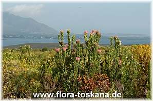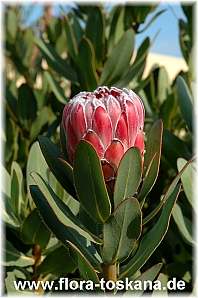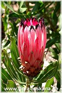 Die Oleanderblättrige Protea (Protea neriifolia), auch Schmalblättriger Zuckerbusch genannt, ist durch die dunkelvioletten, haarigen Spitzen ihrer Tragblätter unverwechselbar. Dafür variiert die Farbe zwischen Rosa, Rot und sogar gelben Tönen. Die Blütenstände öffnen sich kaum, da die Tragblätter einen Zylinder formen, in den man nur allzu gerne hineinspäht, um die dicht zusammengedrängten Blüten im Inneren zu entdecken. Der Name bezieht sich auf die schmalen, glatten Blätter, die von einen deutlichen, gelben Blattnerv mittig geteilt werden. Außerhalb Südafrikas zählt die Oleanderblättrige Protea mit ihren Sorten zu den am häufigsten kultivierten Proteen, da sie sich als vergleichsweise robust, anpassungsfähig ans Klima und blühfreudig erwiesen hat.