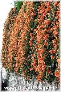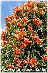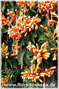 Finden Sie, dass Ihr Wintergarten im Winter etwas farblos daherkommt? Dagegen hat die Feuerranke etwas: Sie öffnet ihre knallig orangeroten Blüten im Februar und März, manchmal auch schon im Januar und ein zweites Mal im Spätsommer. Sie stehen in Büscheln mit 15 bis 20 schlanken Blütentrichtern, aus denen die Staubfäden keck herausschauen. Die südamerikanischen, weitgehend immergrünen, verholzenden Klettermaxe können bis in Höhen von 5 m reichen, um dem Sonnenlicht entgegenzustreben, das sie so gerne mögen. Ebenso gerne wachsen sie kompakt an kleineren Klettergerüsten als frei stehende Obelisque oder als Wandbegrünung. Unser Favorit: Feuerranken, die elegant über einen Mauerrand herabhängen - damit ihre Blüten "züngeln wie Flammen".
