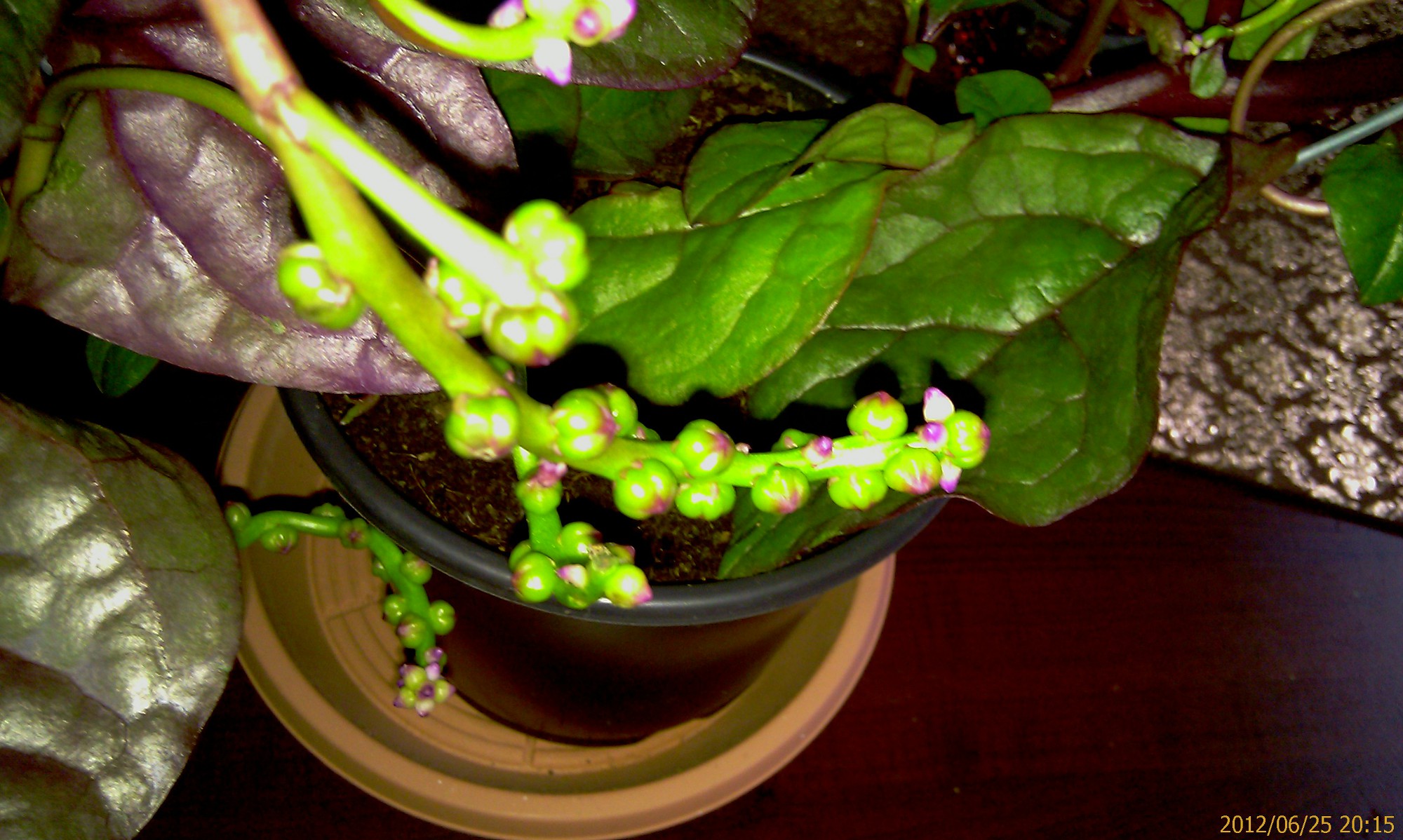 Sie hat die Blätter haben eine dunkelrote unterseite und dunkelrote "Adern" ,rose Scheinblüten und bildet Knubbel aus, die eventuell Früchte sind.
