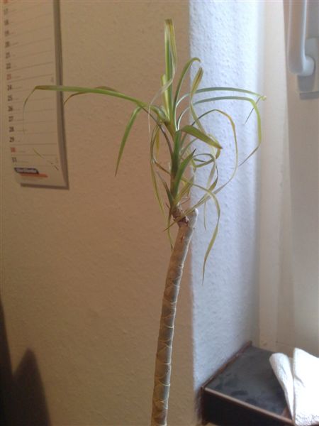 Die Palme ist ein "Findelind", das im Hausflur stand - ihr Stiel war fast 80 cm hoch und sehr dünn und ihre Blätter hingen kraftlos herab. Wie ein ausgesetzter Hund saß sie in der Ecke im Treppenhaus und wir haben es nicht übers Herz gebracht, achtlos an ihr vorbeizugehen. Also haben wir das arme Ding mitgenommen und auf Rat eines Blumenhändlers auf dem Markt in der Mitte geteilt und den oberen Teil in ein Glas Wasser gestellt, den unteren Teil (mit den Wurzeln) an der Schnittstelle mit Wachs versiegelt. Und tatsächlich: Bald schon konnten wir bei der einen Palme Wurzelbildung beobachten, bei der anderen neue Triebe. Nach einigen Monaten hatten wir zwei wunderbare Palmen, die kräftig austrieben.