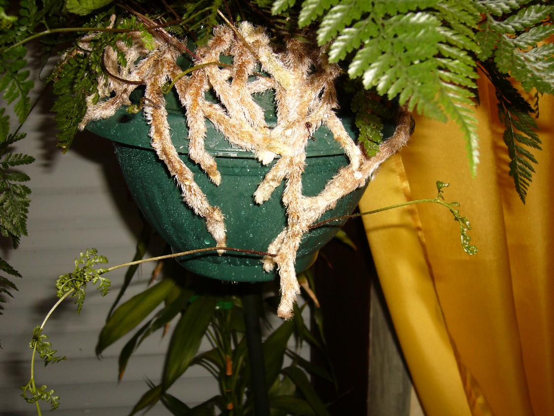 Also - wir haben den Farn jetzt so ca. 14 Tage. Aus dem Topf wachsen so Puschels raus.