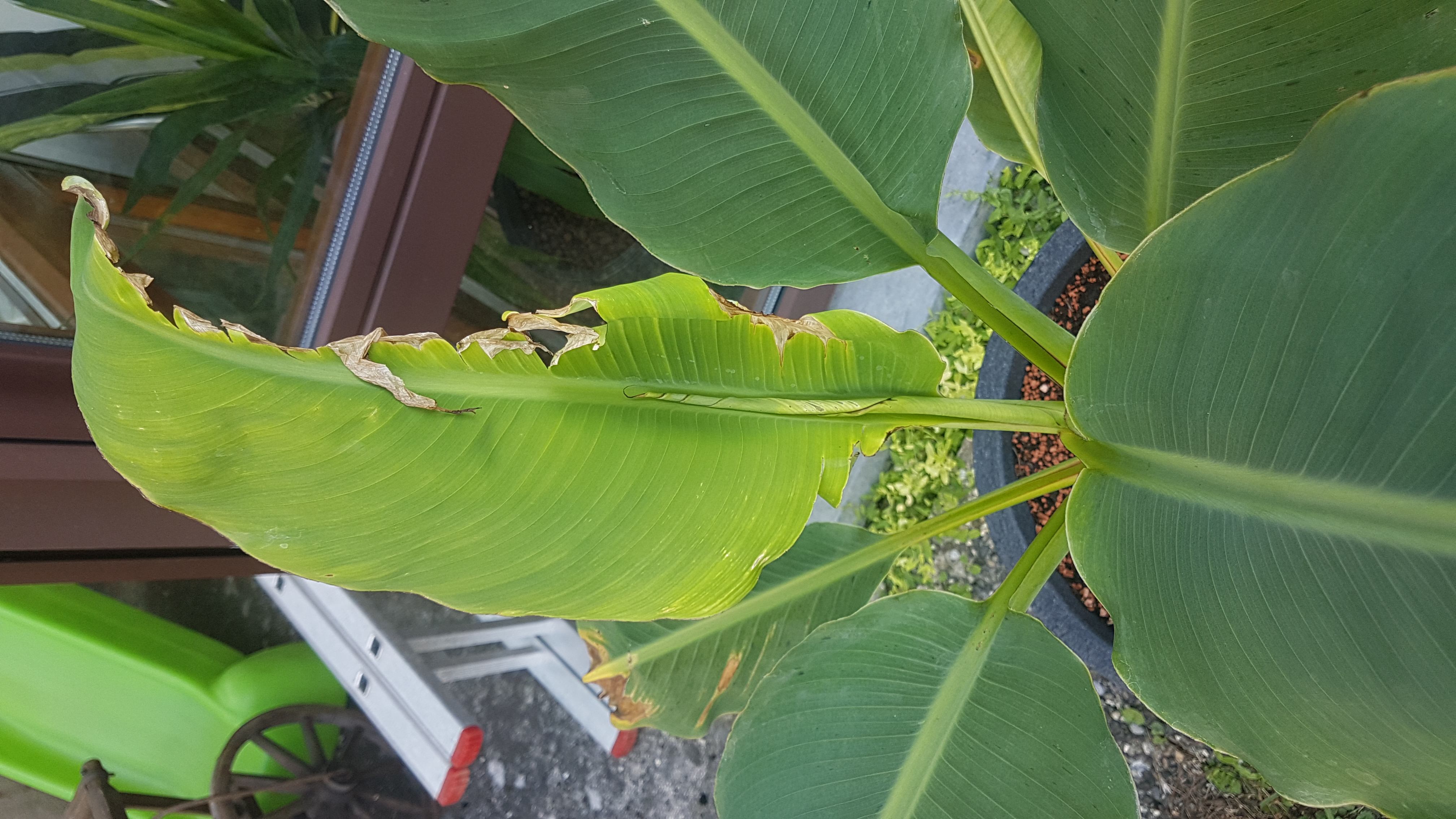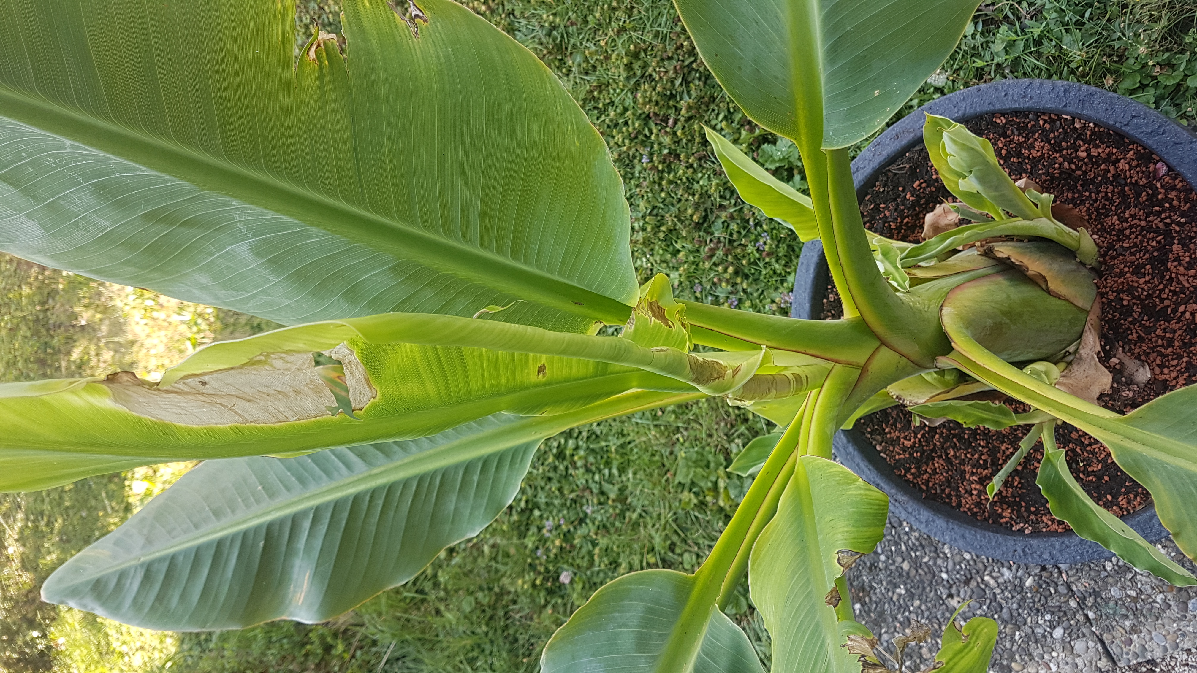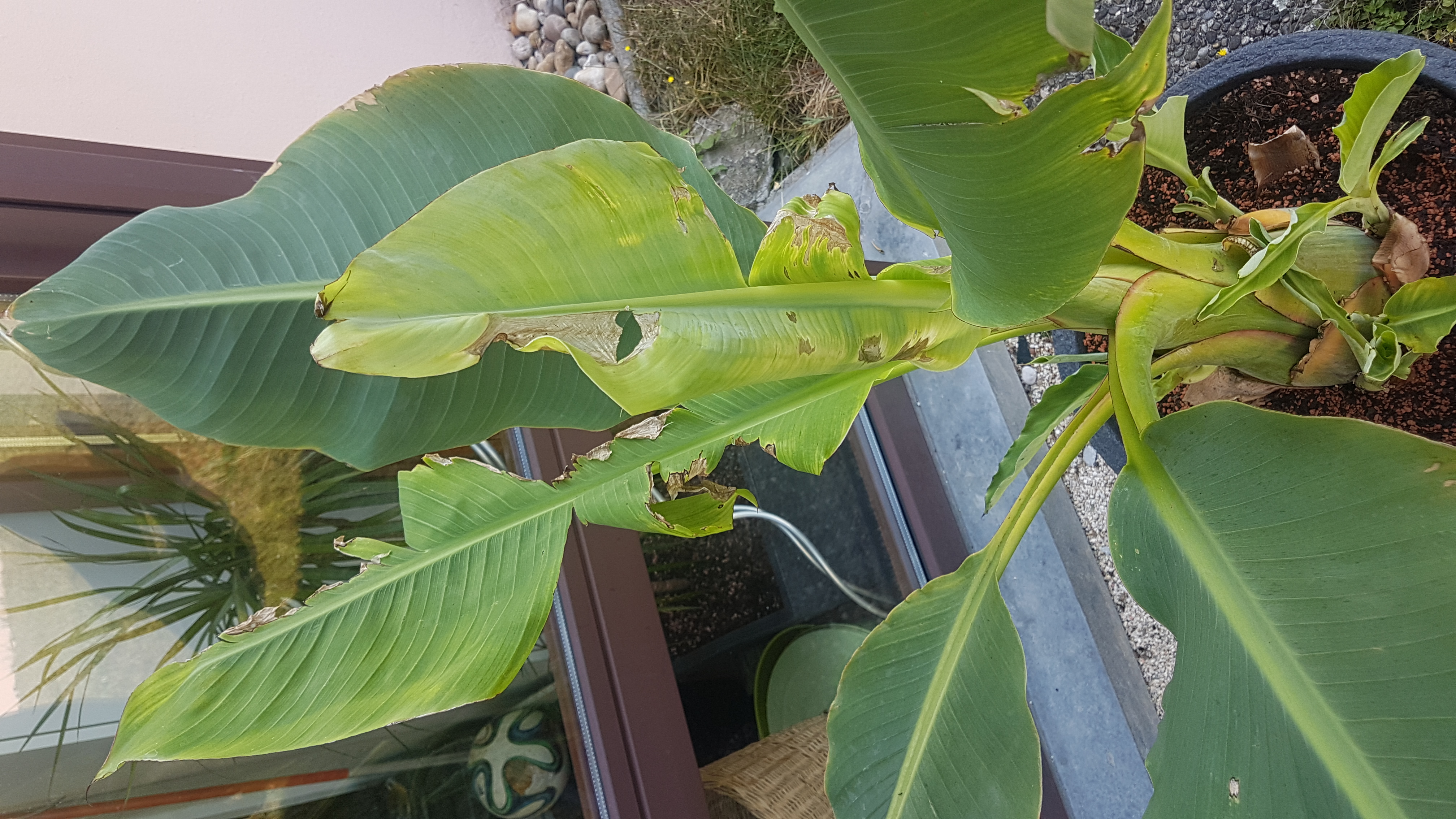 Ich habe folgendes Problem: Im Mai habe ich mir 2 Bananenpalmen (Musella lasiocarpa) angeschafft. Beiden ging es immer gut, der Boden sowie Topfgröße und Standort sind wie empfohlen gewählt (es gibt immer mal wieder Wind, aber das lässt sich bei mir auch kaum vermeiden) und sie werden regelmäßig gedüngt/Staunässe gibt es keine. Seit 2-3 Wochen kommen die neuen Blätter allerdings extrem fehlerhaft nach (s. Bilder). Schädlinge werden von meinem Kollegen ausgeschlossen (er kennt sich in dem bereich gut aus, sagt aber selbst er hat kein Plan was es sein könnte)