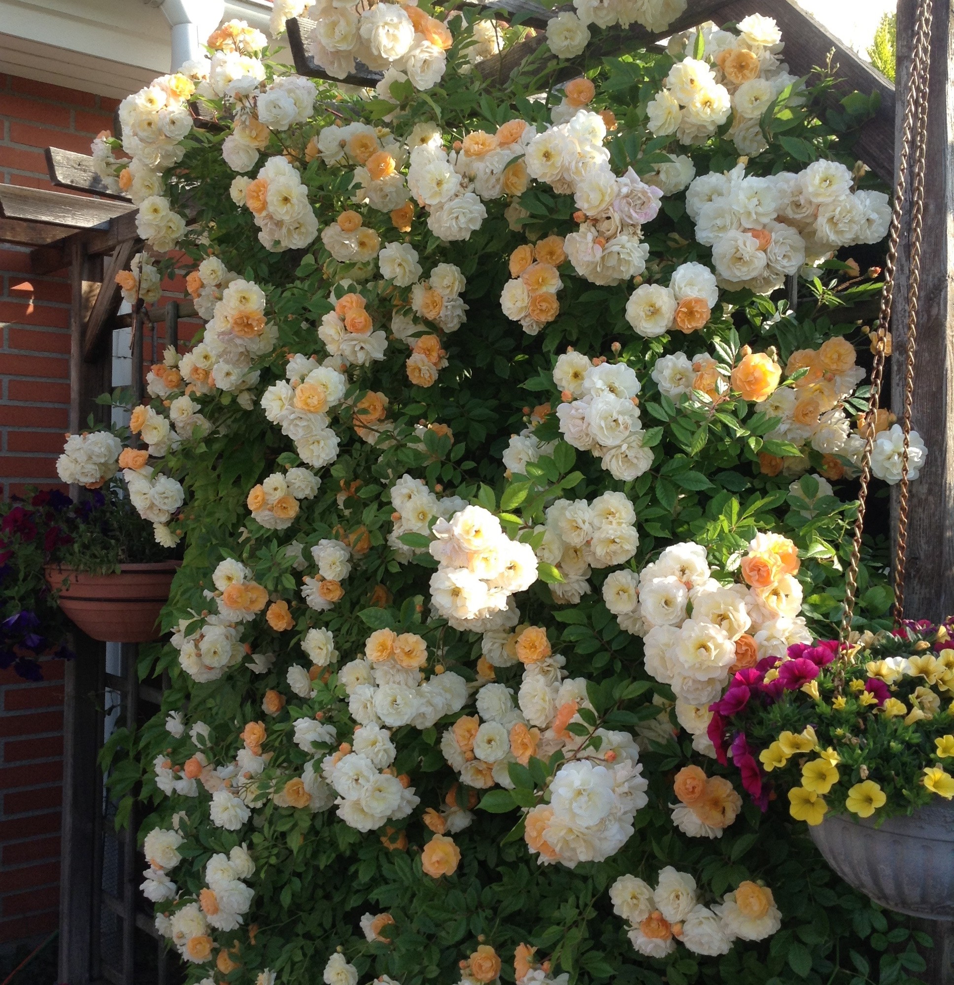 Ich möchte wissen, ob man sie zur 2. Blüte anregen kann, wenn man die verblühten Blüten abschneidet (was bei der Blütenmenge einer Strafarbeit gleichkommen würde...). Wie die Rose genau heißt, weiß ich nicht mehr. Die Knospen sind anfangs apricot-farben und werden dann creme-weiss.