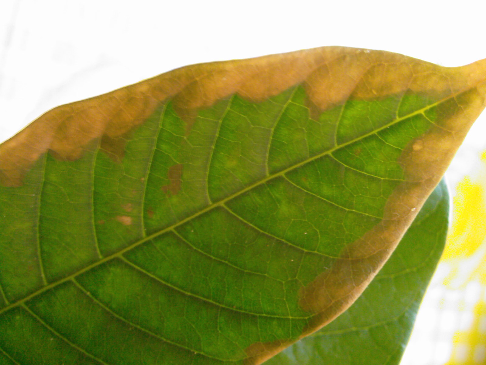 Meine Rambutan (inzwischen ein dreiviertel Jahr alt) bekommt jetzt lauter hässliche braune Flecken, die vom Rand des Blattes her nach Innen wachsen.