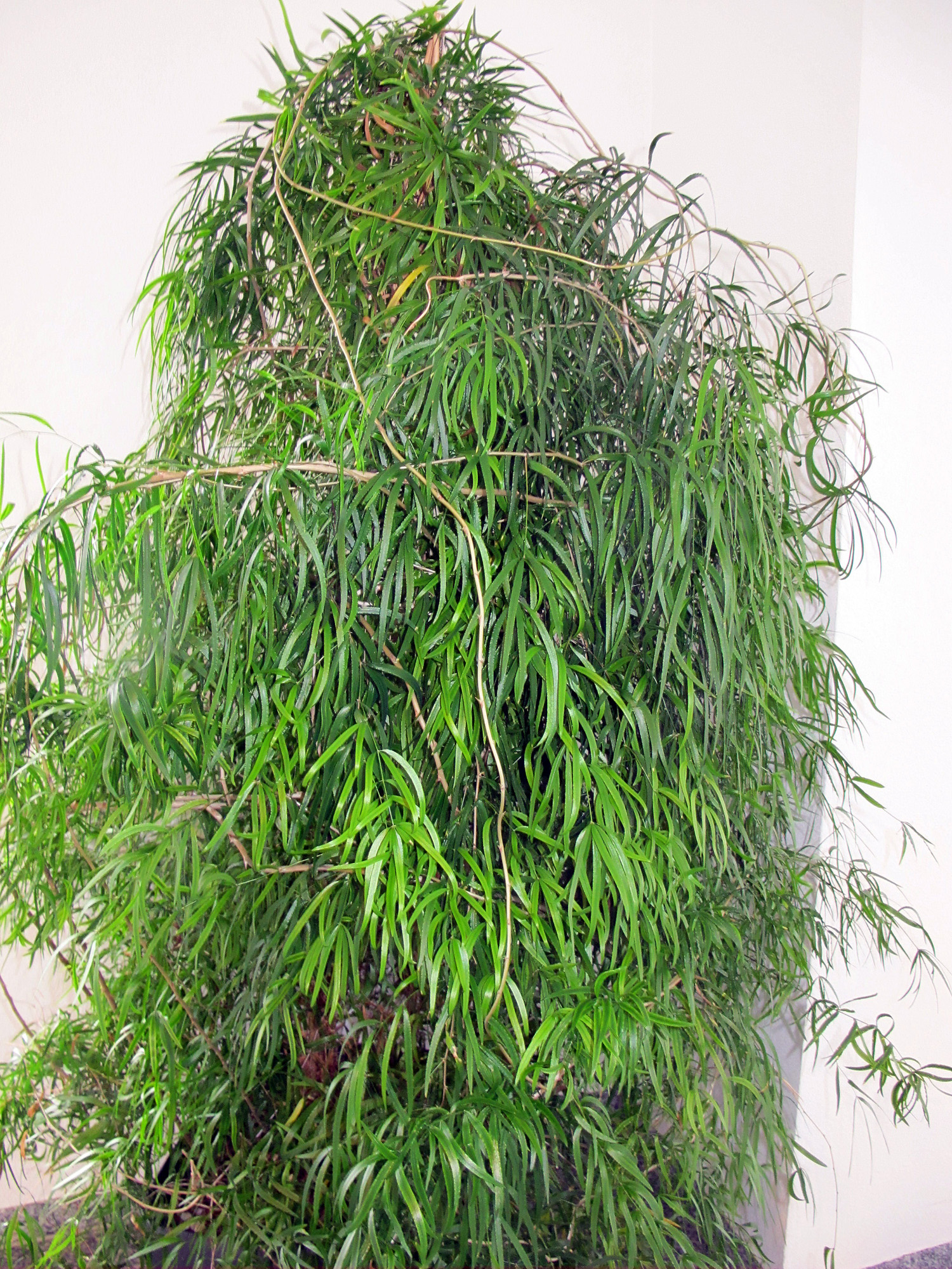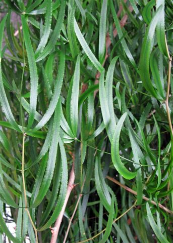 meistens überwiegt ja der Ehrgeiz, eine Pflanze selbst bestimmen zu wollen, den Wunsch, ihren Namen in Minutenschnelle im Green-Forum zu erfahren. Zur Beantwortung einer Kreuzworträtselfrage holt man sich ja auch erst dann Hilfe aus dem Internet, wenn man sich die Zähne daran ausgebissen hat. So ergeht es mir mit dem hier abgebildeten, verschlungenen Zimmerpflanzenrätsel, das sich mir in einer Zahnarztpraxis gestellt hat. Die ca 15 cm langen und 2-3 cm breiten, am Rande leicht gewellten Blätter sitzen meist zu Dritt etagenweise am Stengel, zusammen mit einem kleinen, spitzen Zahn. Die Seitentriebe enden z.T. in einem, aus 5-7 Blättern gebildeten "Schirm".