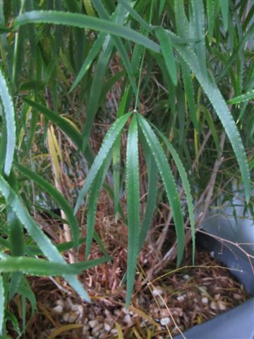 meistens überwiegt ja der Ehrgeiz, eine Pflanze selbst bestimmen zu wollen, den Wunsch, ihren Namen in Minutenschnelle im Green-Forum zu erfahren. Zur Beantwortung einer Kreuzworträtselfrage holt man sich ja auch erst dann Hilfe aus dem Internet, wenn man sich die Zähne daran ausgebissen hat. So ergeht es mir mit dem hier abgebildeten, verschlungenen Zimmerpflanzenrätsel, das sich mir in einer Zahnarztpraxis gestellt hat. Die ca 15 cm langen und 2-3 cm breiten, am Rande leicht gewellten Blätter sitzen meist zu Dritt etagenweise am Stengel, zusammen mit einem kleinen, spitzen Zahn. Die Seitentriebe enden z.T. in einem, aus 5-7 Blättern gebildeten "Schirm".