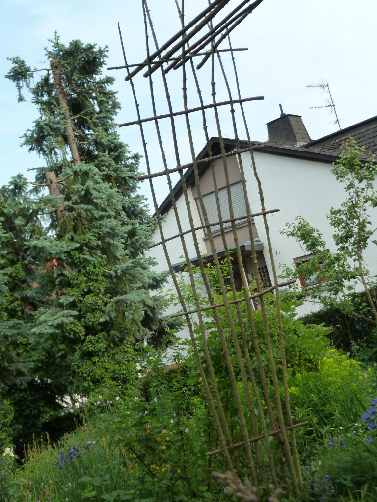 ich hab´ malwieder mehr Kletterpflanzen als Platz für diese, deshalb eine neue Rankhilfe, rechts für Cobea scandens, links (am Baum) für eine Ipomoea.