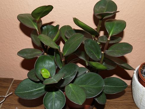 meine Mutti hat mir im vergangenen Jahr eine gummibaumartige Pflanze mitgebracht, die fleischige runde Blätter hat und Blütenstangen (ohne irgendwelche Blütenblätter, nur kurzzeitig mit Blütenstaub) hatte, die einem Rattenschwanz ähneln und bis zu 15cm lang wurden und senkrecht nach oben ragten. Die fühlten sich sogar an, wie ein Rattenschwanz...