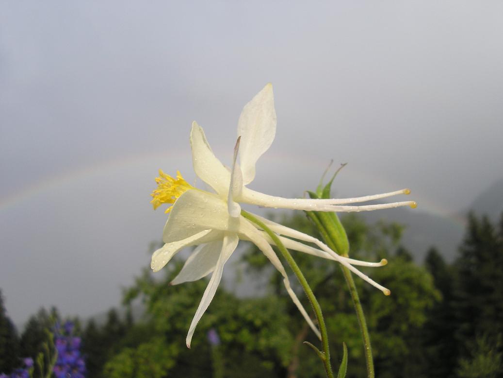 Ich hab auch welche Sie zeigen eine Aquilegia x chrysantha (Goldakelein Haybride) mit dem Regenbogen im hintergrund.