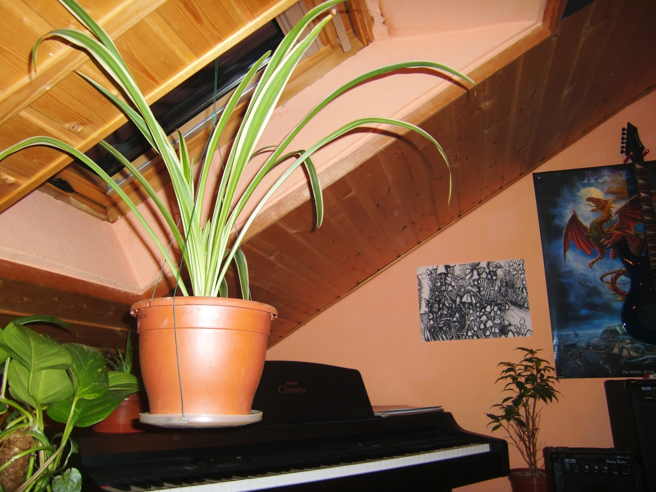 Und zuletzt noch der Ficus Benjamin. Der steht jetzt am weitesten von den Fenstern weg, da ich den nicht direkt ans Fenster stellen kann, da er dafür zu hoch ist und der sehr empfindlich schon allein auf die Morgensonne reagieren kann, aber auch ihn die Mittagssonne bescheint, weil er eben zu hoch an die Scheibe ragt. Da er es aber auch halbschattig mag, stellte ich ihn jetzt ca 2m seitlich vom Fenster weg und lasse ihn dort jetzt auch, damit der nicht unnötig gestresst wird.