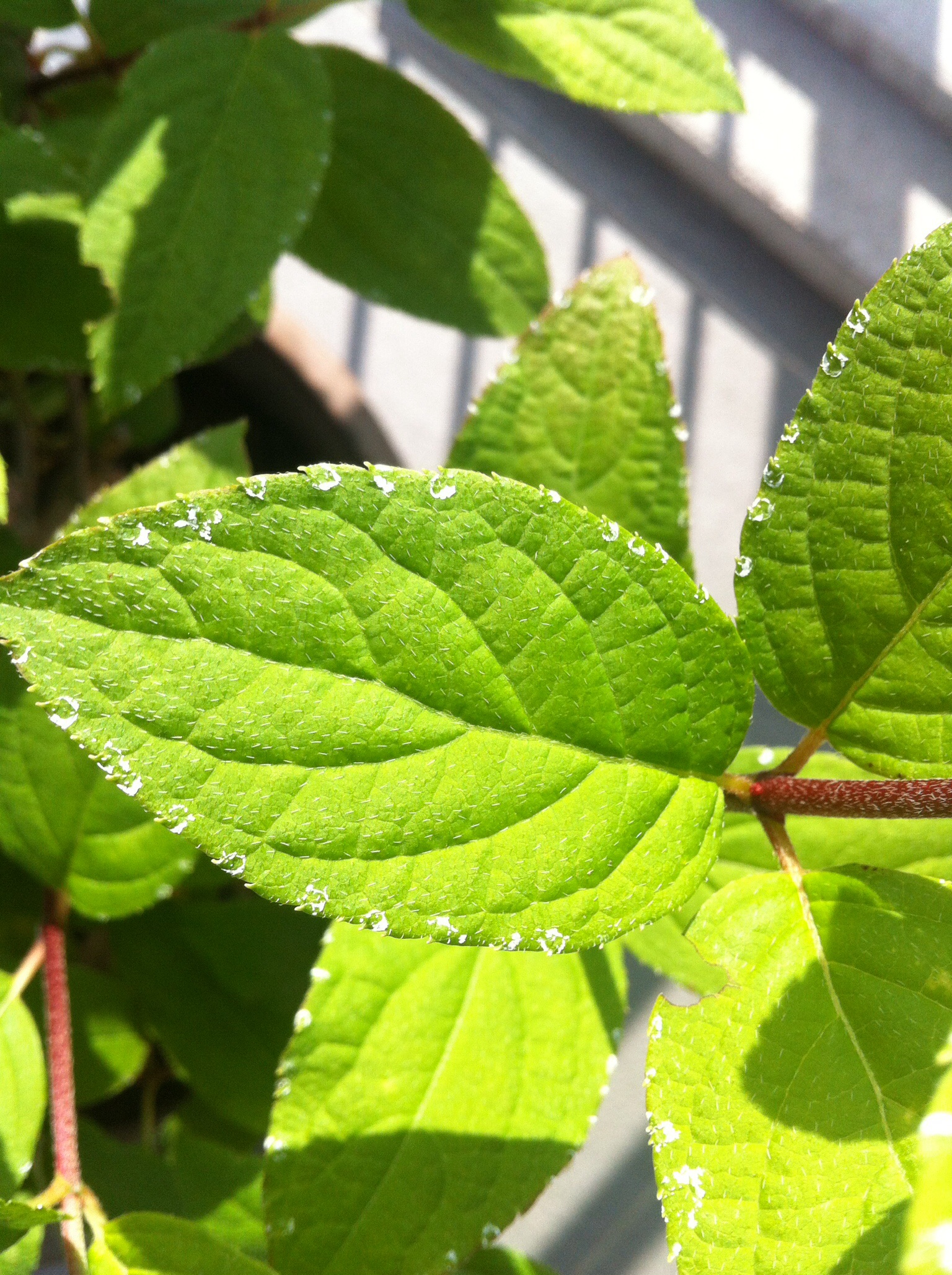 vor wenigen Tagen habe ich mir eine Rispenhortensie gekauft. Nun hat sie über Nacht auf fast allen Blättern weiße Flecken am Blattrand bekommen. Es sieht aus, als hätte man mit einem Pinsel weiße Farbe drauf getupft.