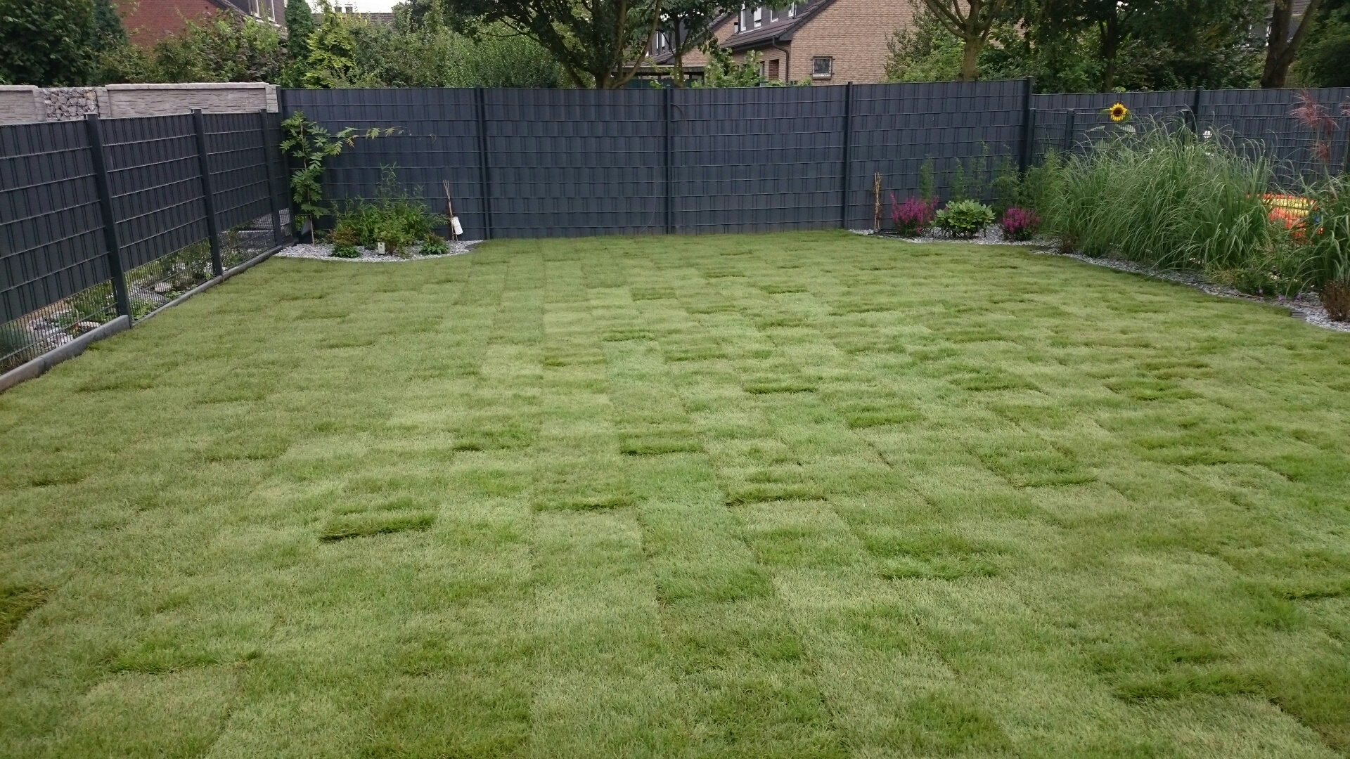 Anfang August haben wir in unserem im letzten Jahr neu angelegten Garten endlich Rollrasen verlegt.