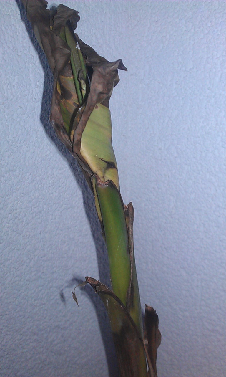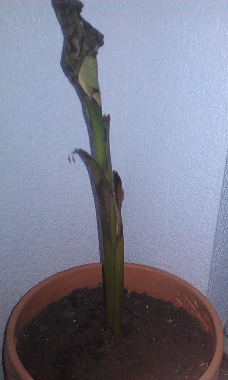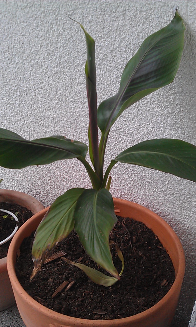 Seit ca 6 Wochen besitze ich eine Rosa Zwerg Banane. Auslieferungsgröße lag bei guten 30cm mit 5 Blättern. Mittlerweile hat sie ihr 1. neues Blatt gebildet.
