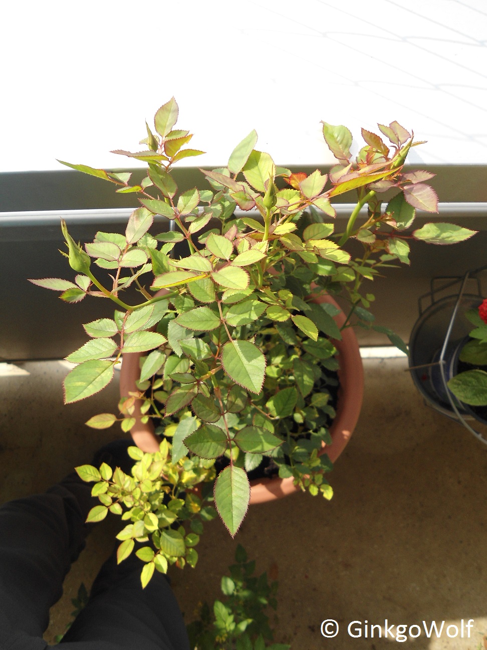 Also, die "Regenbogenfarbe" der Blätter scheint sich von selbst wieder zu geben, ich meine gestern gesehen zu haben, dass sie grün nachdunkeln. Also war's wahrscheinlich nur so 'ne Art Sonnenschutz oder die Neuaustriebe sehen einfach so aus.