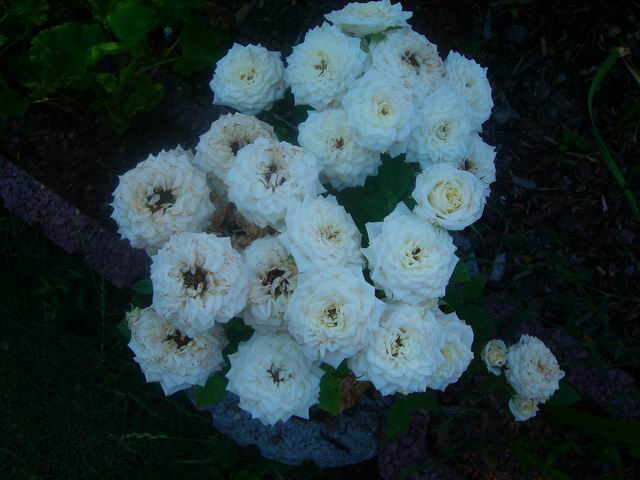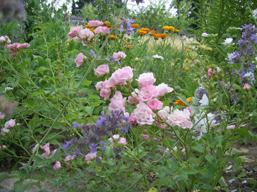 Meine einzige, von der ich den Namen weiß, weil selbstgekauft Alle meine Bekannten, die sich besser mit Rosen auskennen als ich, haben mich geschimpft: "Was, Du kaufst Dir dieses triviale Unkraut?" O.k., sie duftet nicht, und als Monokultur am Straßenrand finde ich sie auch nicht so toll, aber im romantischen Mix finde ich sie sehr niedlich, vor allem auch, weil sie so kleinblütig ist. Und unkompliziert soll sie auch sein, da ist sie bei mir genau richtig