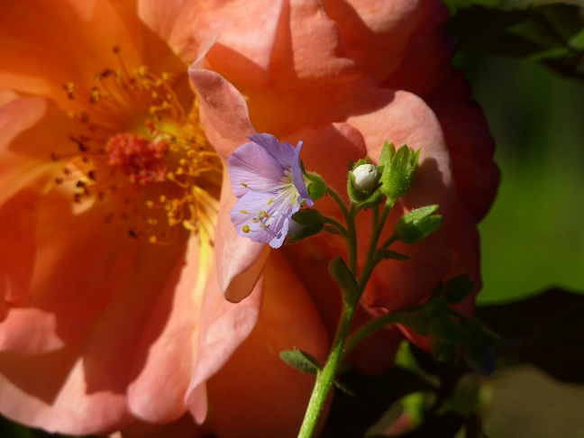 Meistens hat die Westerland ihre Blüten am Ende von 1,50 bis 2 m langen Trieben und die Jakobsleiter wird gerade einmal 50 cm hoch. Aber glücklicherweise ist der Föhnsturm ja so nett und legt die Rose ab und an darnieder, sodass sie die Jakobsleiter besser umgarnen kann, oder wer da wehn umgarnt