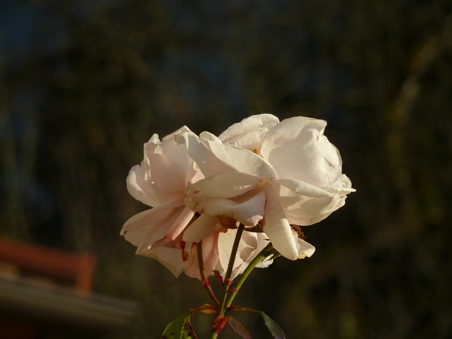 Gucke mal, das fand ich heute total spannend. Beide Blüten sind an meinem Avatar-Rosenstrauch im Vorgarten, an dem immer gediebt wird.