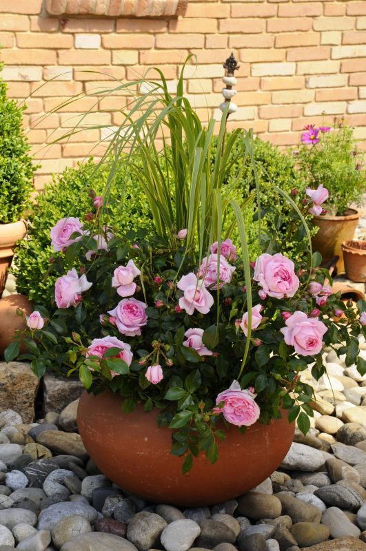 Im Prinzip eignen sich alle Gartenrosen für große Pflanzgefäße. Natürlich bieten sich für „Rosenverrückte" die besonders reich blühenden Sorten mit einem harmonischen Wuchsbild an. Hier wird man auf jeden Fall im Sortiment der Beetrosen (z.B. ´Garden of Roses´, ´Rosenfee´) oder Zwergrosen (z.B. ´Pepita, ´Roxy´, ´Zwergenfee 09´, ´Out of Rosenheim´) fündig. Diese blühen bis zum Frost immer wieder und zeigen sich selten ganz ohne Farbe. Auch mit Sorten aus der Gruppe der Kleinstrauchrosen (z.B. ´Escimo´, ´Knirps´) kann man attraktive Kompositionen in Pflanzkübeln gestalten, da diese mit ihrem meist breitbuschigen Wuchs reizvoll über den Topfrand hängen.