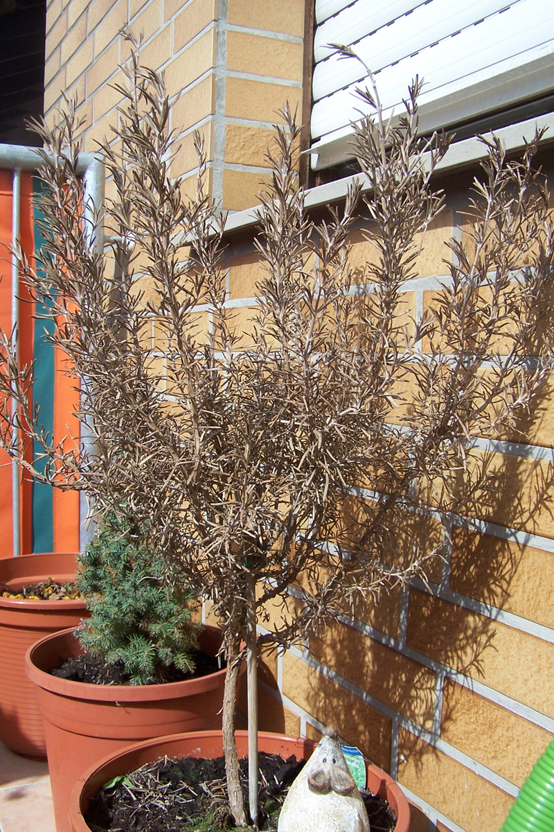 ich habe mir letzten Sommer ein kleines Rosmarinbäumchen gekauft und über den Winter auf dem Balkon stehen lassen. Nun sind die Nadeln ganz braun und trocken geworden. Ich habe mal einen etwas dickeren Ast abgeschnitten. Dieser war von innen noch grün, also scheint ja noch Leben drin zu stecken