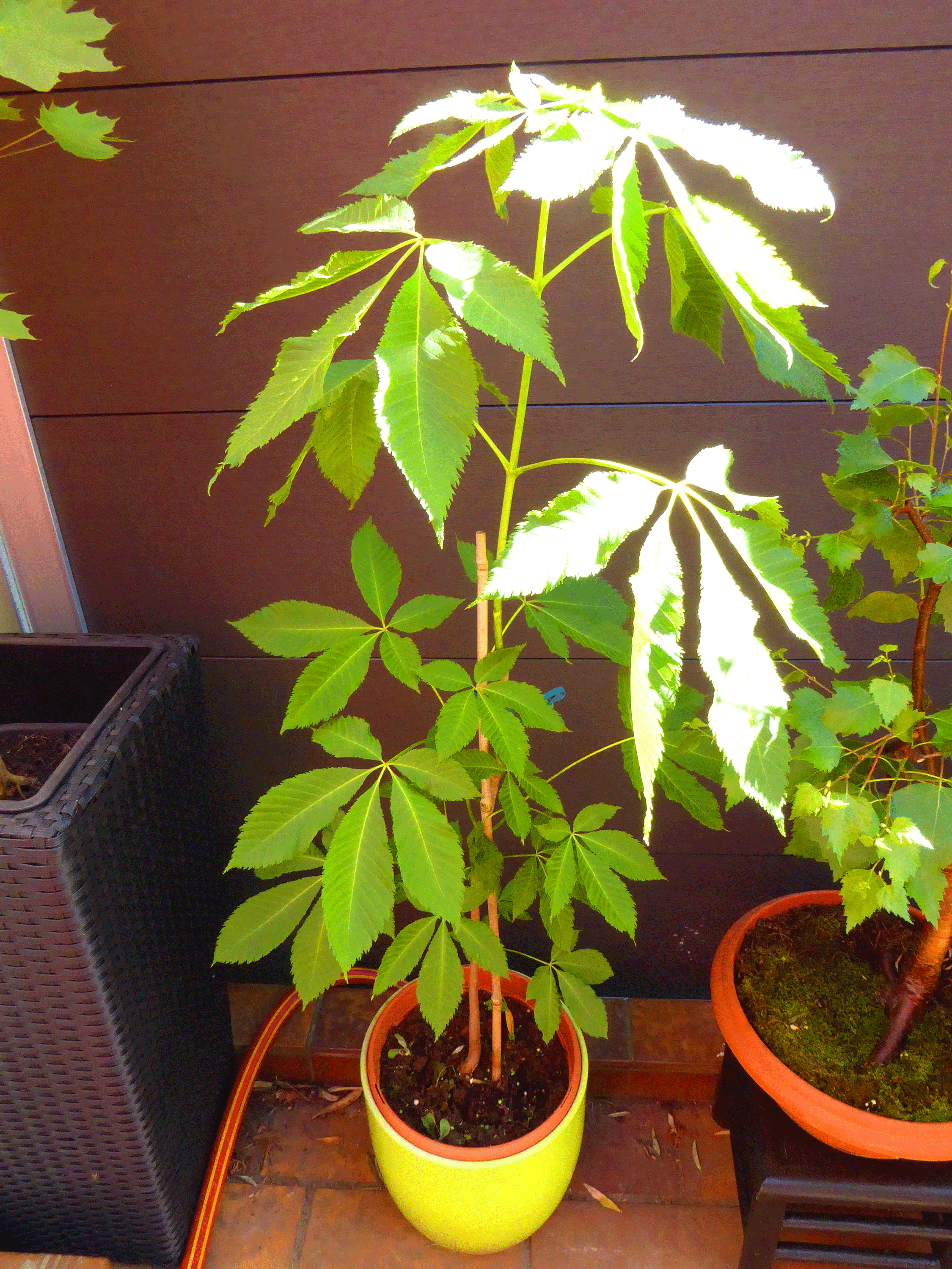 Meine Rosskastanie aus meinem Topfbaumgarten war dies Jahr ganz schön in die Höhe geschossen - aber Blüten hatte sie die Jahr wieder keine einzige Deshalb und weil sie mir bis fast an die Brust reichte hab ich sie dann eingekürzt. Jetzt ist sie etwa halb so groß, also vllt vierzig bis fünfzig Zentimeter (geschätzt - nachgemessen hab ich nicht). Fotos stell ich demnächst rein. Nach dem Schneiden hab ich ihr gleich eine Ration Biodünger verpasst. Vllt macht sie ja auch noch einen Ersatztrieb. Mal schauen.