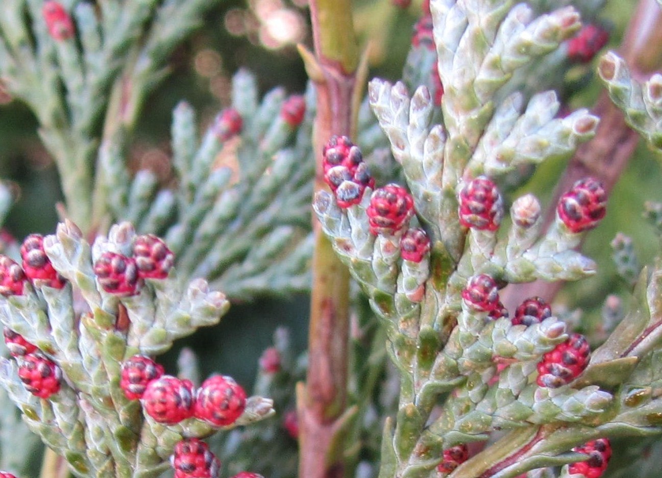 Rote Kügelchen ? Blüten von Chamaecyparis lawsoniana
