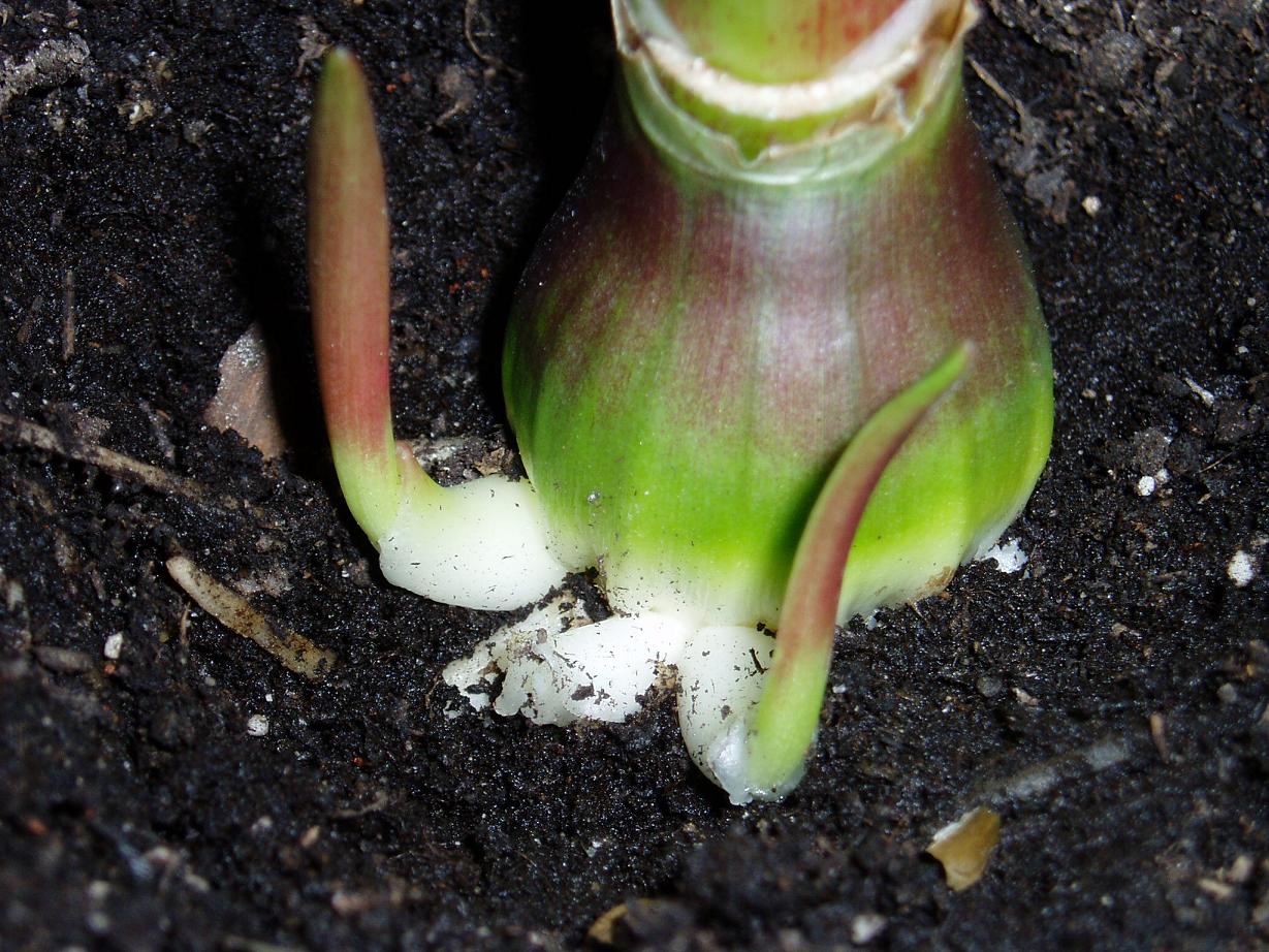 Nachdem ich vor ein paar Tagen zwei kleine Blättchen neben meiner einjährigen Amryllis aus der Erde sprießen sah, bin ich der Sache heute (im warsten Sinne des Wortes) auf den Grund gegangen und habe mit einem Pinsel vorsichtig ein bisschen Erde entfernt...