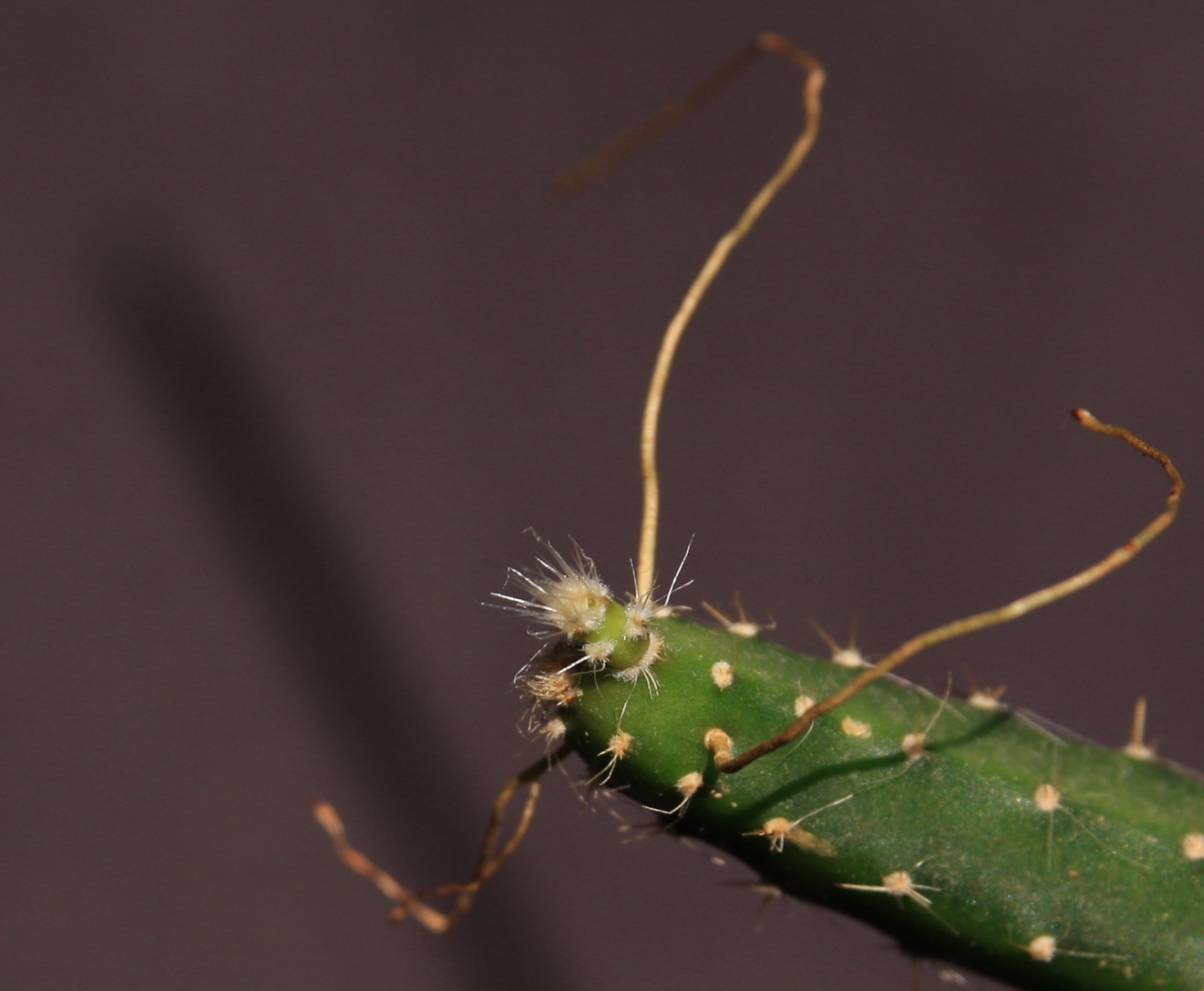 Kannst dich noch an das eine Rhipsalis-Kreppirdl erinnern? Der will scheinbar der Mördermonsteropuntie Konkurrenz machen. und das Ding hat vielleicht Wurzeln entwickelt den Winter über So große Pötte gibt's normalweise ned so schnell für die Gagdussdinger