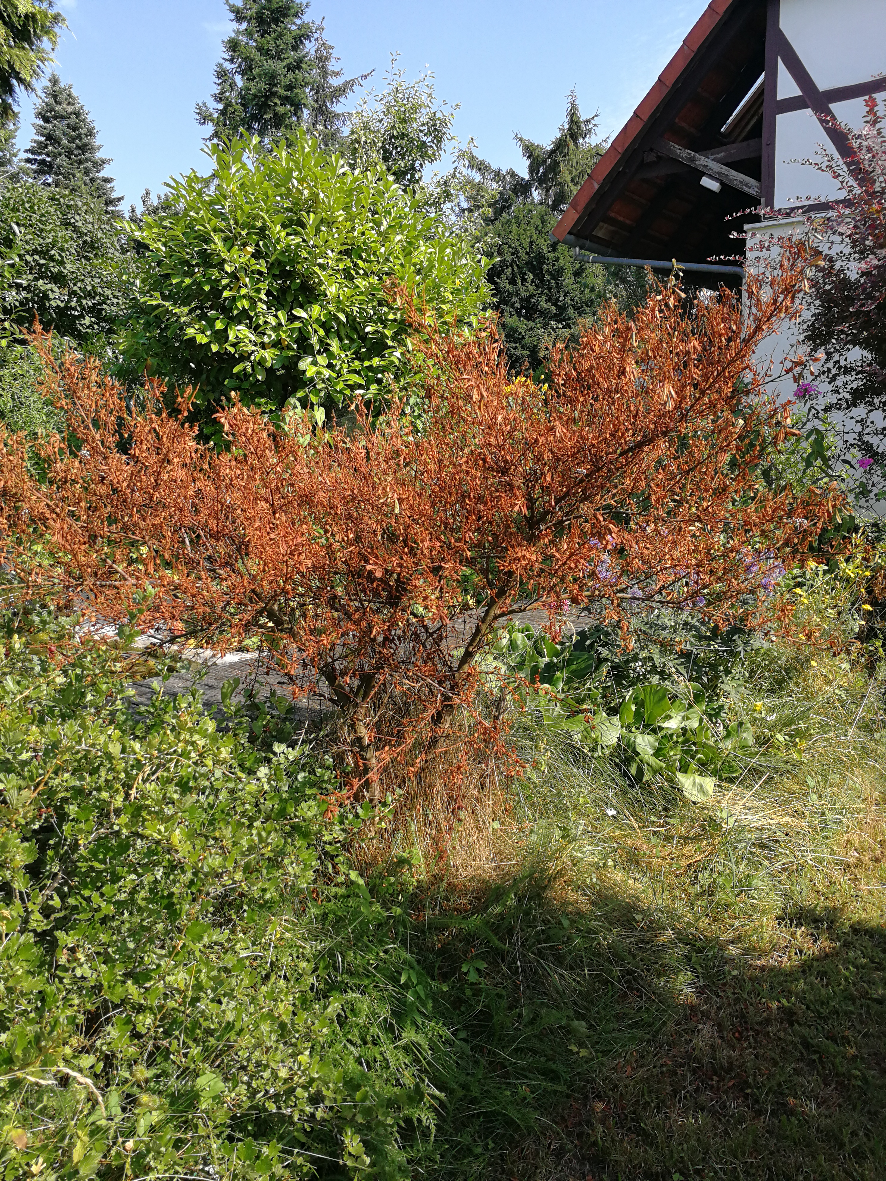 Das Bäumchen stand dort schon 3, 4 Jahre am Hang neben einer Stachelbeeren und Begonie. Die Bedingungen haben sich nicht geändert. Ja, der ist eine Menge Rasen hineingewachsen, aber das war schon öfter mal. Die ist innerhalb von ein paar Tagen so vergangen und lt. Internet pflegeleicht. Ab und an mal ein Schuß extra Wasser. Den heißen Sommer im letzten Jahr hat sie auch überstanden. Da waren bisher immer nur mal ein paar Äste nach dem Winter kaputt. Die waren dann aber einfach nur vertrocknet und nicht so orange, wie jetzt.