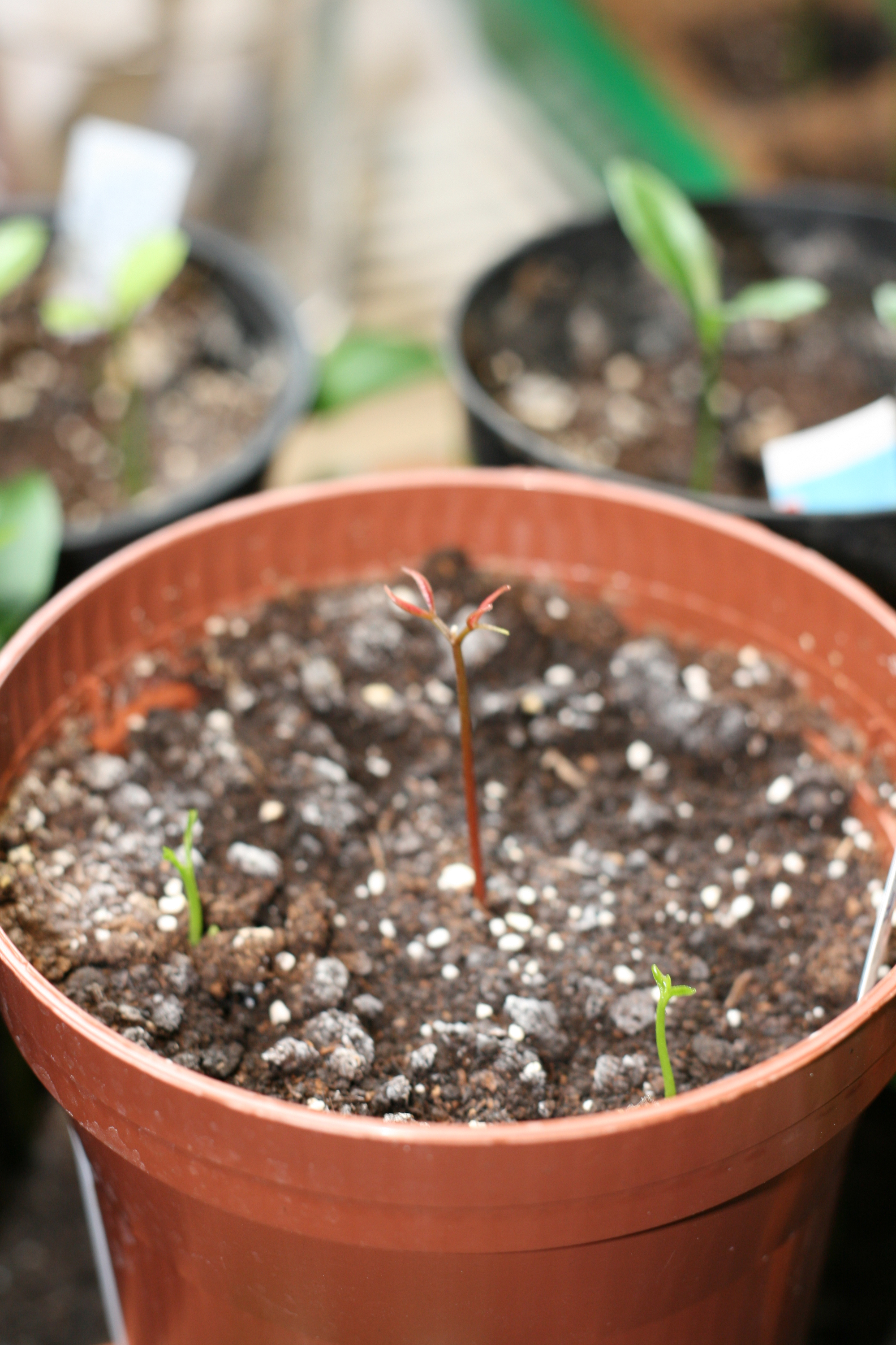 Hier mal ein aktuelles Bild.. Nicht nur die Farbe des Triebes ist ungewöhnlich, auch die Form der Keimblätter...