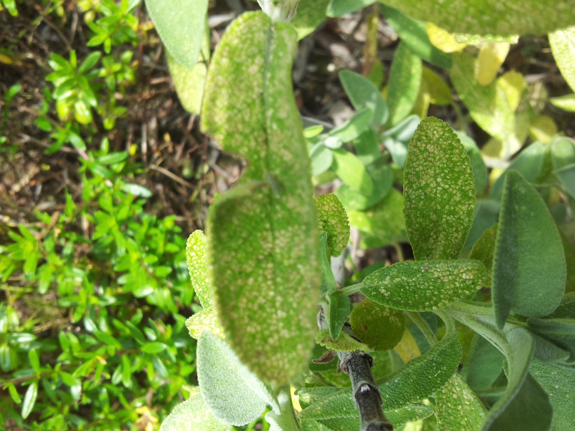 auf meinem Salbei, der schon seit letztem Jahr im selben Gefäss zusammen mit Thymian und Estragon steht, bilden sich zusehends gelbe Punkte auf den Blättern. Die neuen Triebe sind nicht befallen, aber noch unten durchgehend. Was kann das sein und gibt es Abhilfe?