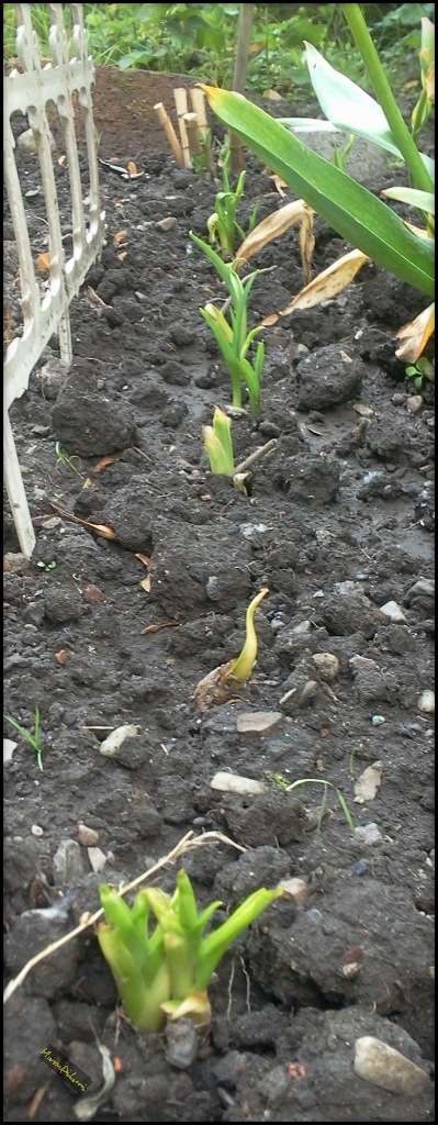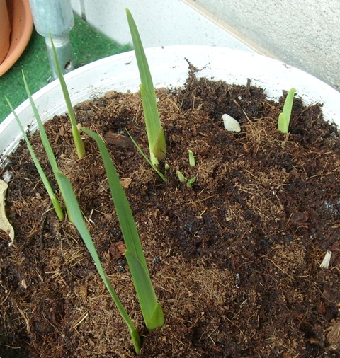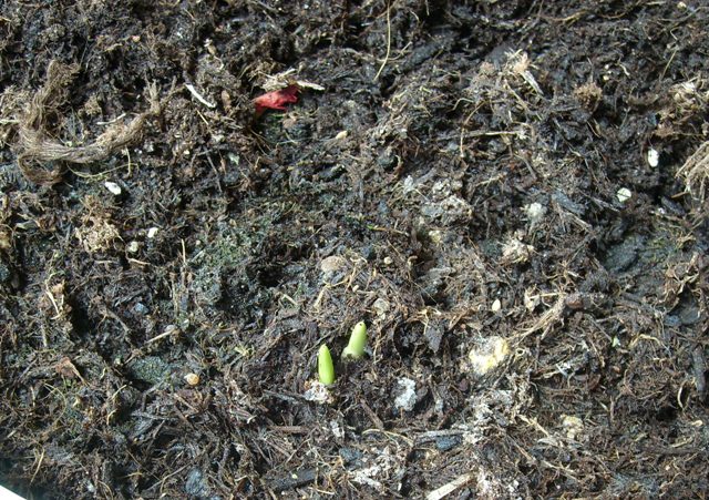 Gestern habe ich beim Greentreffen noch erzählt, bei mir kommt noch überhaupt nichts von den ganzen Knollen und heute morgen sehe ich zwei zarte Spitzen sich durch die Erde drücken. So eng nebeneinander hatte ich die Knollen eigentlich nicht verbuddelt
