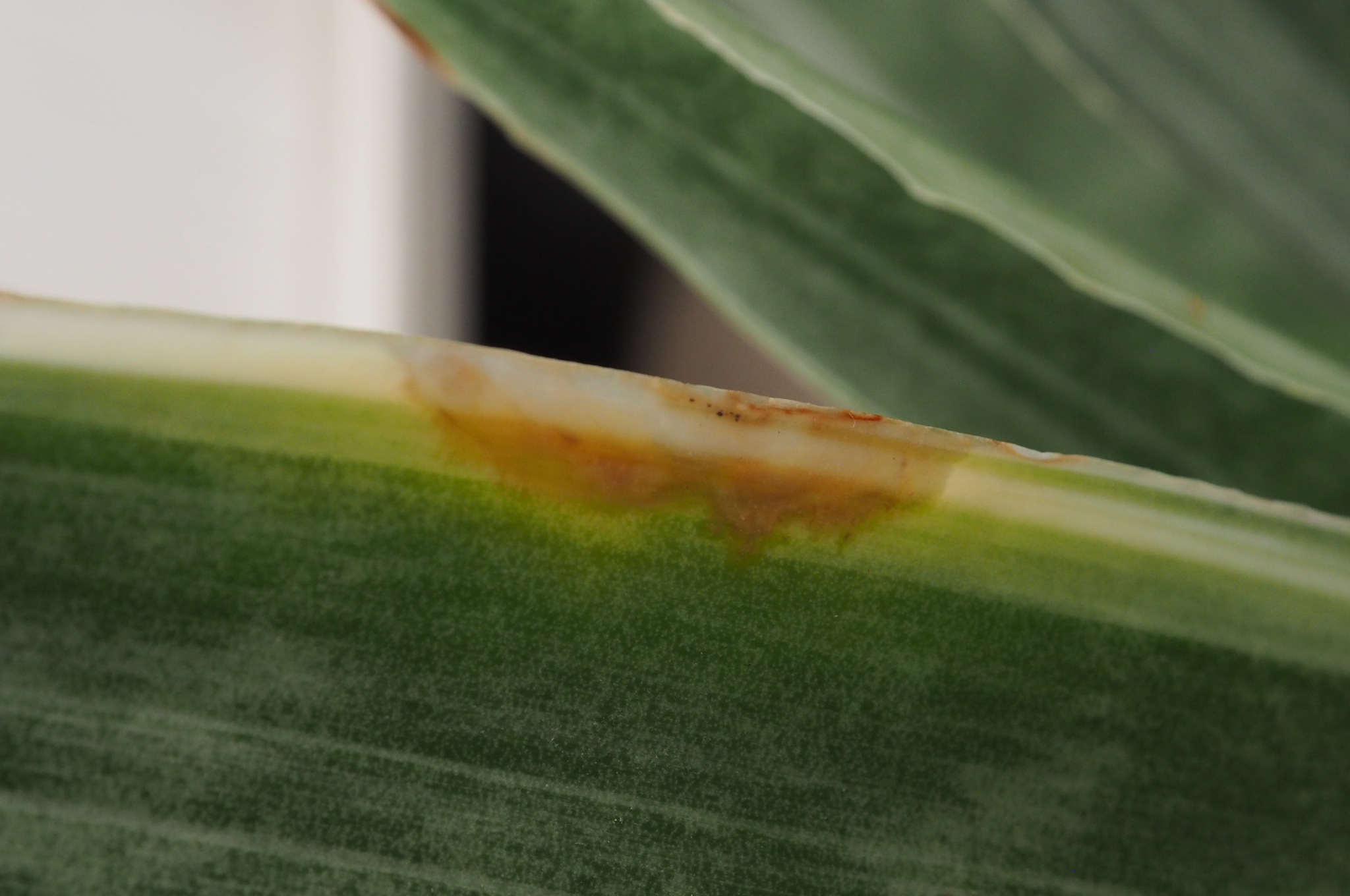 Ich habe heute eine glasige, feuchte Stelle am Blattrand meiner relativ neue eingezogenen Sansevieria festgestellt. Ich glaube da habe ich beim Gießen gepennt, denn die Erde ist nich ziemlich feucht, obwohl das Gießen schon einige Tage her ist. Sie steht in Kokoserde und bekommt ausreichen Licht. Sie steht nur für das Foto draußen, ansonsten drinnen.