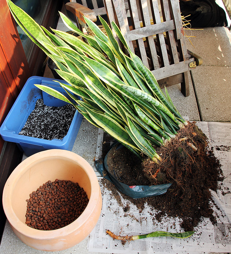 Dieses ist das zweite Geschenk, das ich gestern erhalten habe, Sansevieria trifasciata 'Laurentii'. Mein Rücken hat sich bedankt! Das längste Blatt ist 115 cm lang. Der alte Tontopf wurde gesprengt, einen neuen habe ich noch nicht, aber hier muß schnell etwas passieren. Was für ein Substrat sollte man nehmen, ist reine Kakteenerde in Ordnung? Würdet ihr dieses Gewächs teilen, oder meint ihr, daß es so besser wirkt? Bin in dieser Frage hin- und hergerissen.