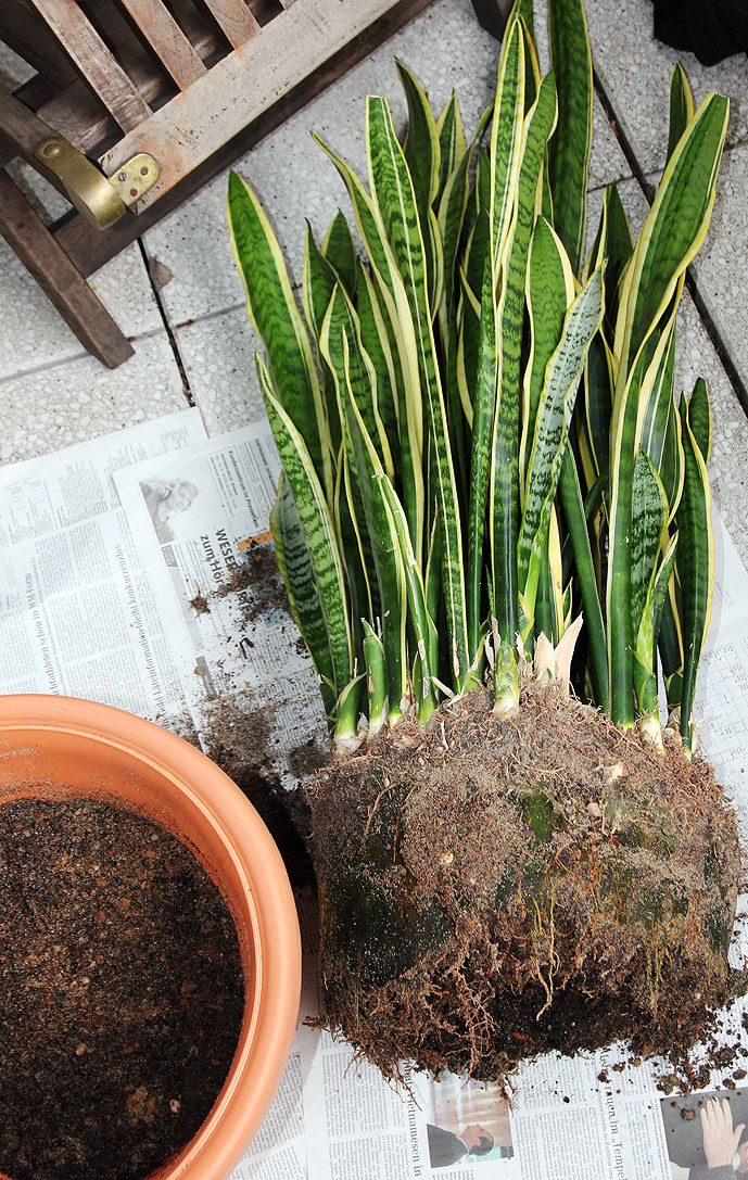 Dieses ist das zweite Geschenk, das ich gestern erhalten habe, Sansevieria trifasciata 'Laurentii'. Mein Rücken hat sich bedankt! Das längste Blatt ist 115 cm lang. Der alte Tontopf wurde gesprengt, einen neuen habe ich noch nicht, aber hier muß schnell etwas passieren. Was für ein Substrat sollte man nehmen, ist reine Kakteenerde in Ordnung? Würdet ihr dieses Gewächs teilen, oder meint ihr, daß es so besser wirkt? Bin in dieser Frage hin- und hergerissen.