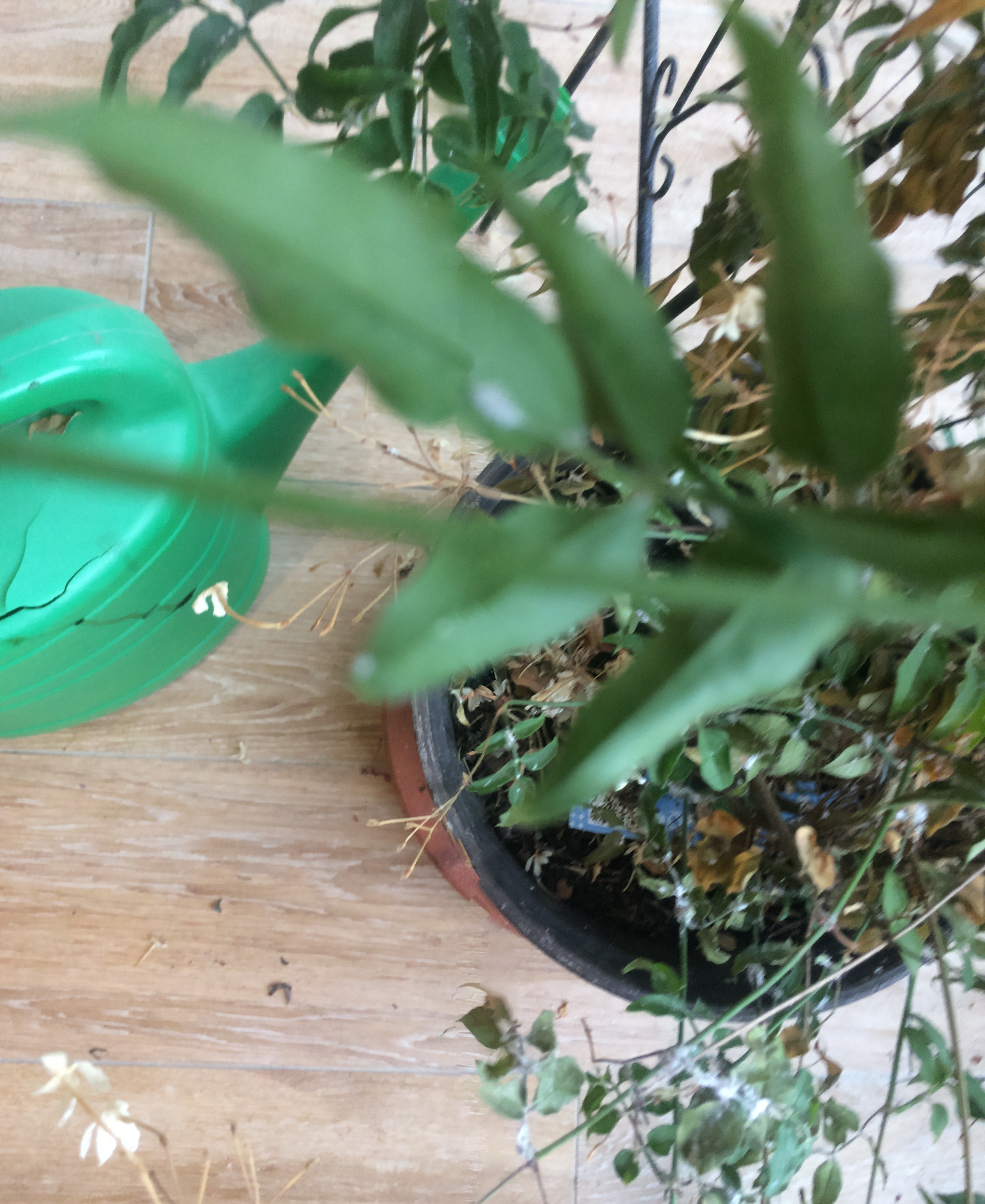Der Jasmin ist im Topf, steht drin im Flur (hell und kühl).
