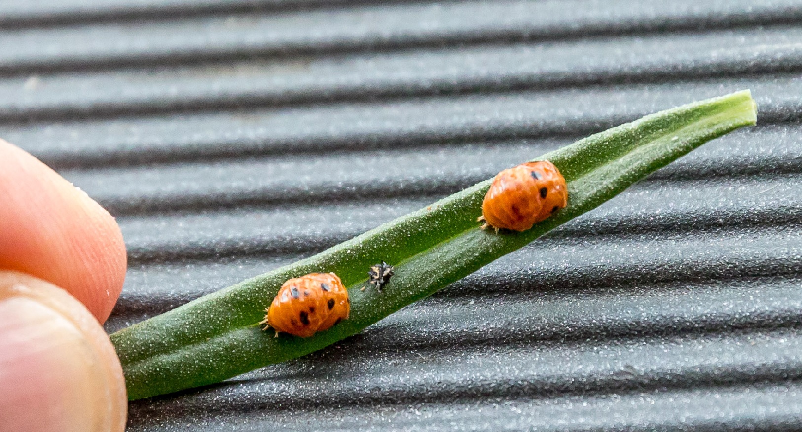 seit einigen tagen ist mir nun aufgefallen, dass sich viele käfer auf den blattoberseiten sehen lassen. sie sehen ähnlich dem marienkäfer aus, aber haben eine andere zeichnung. auch sind sie festgesaugt auf den blättern und lassen sich nur mit einem "pnapf" abnehmen. oft ist dazwischen oder daneben eine schwarze klebrige masse.