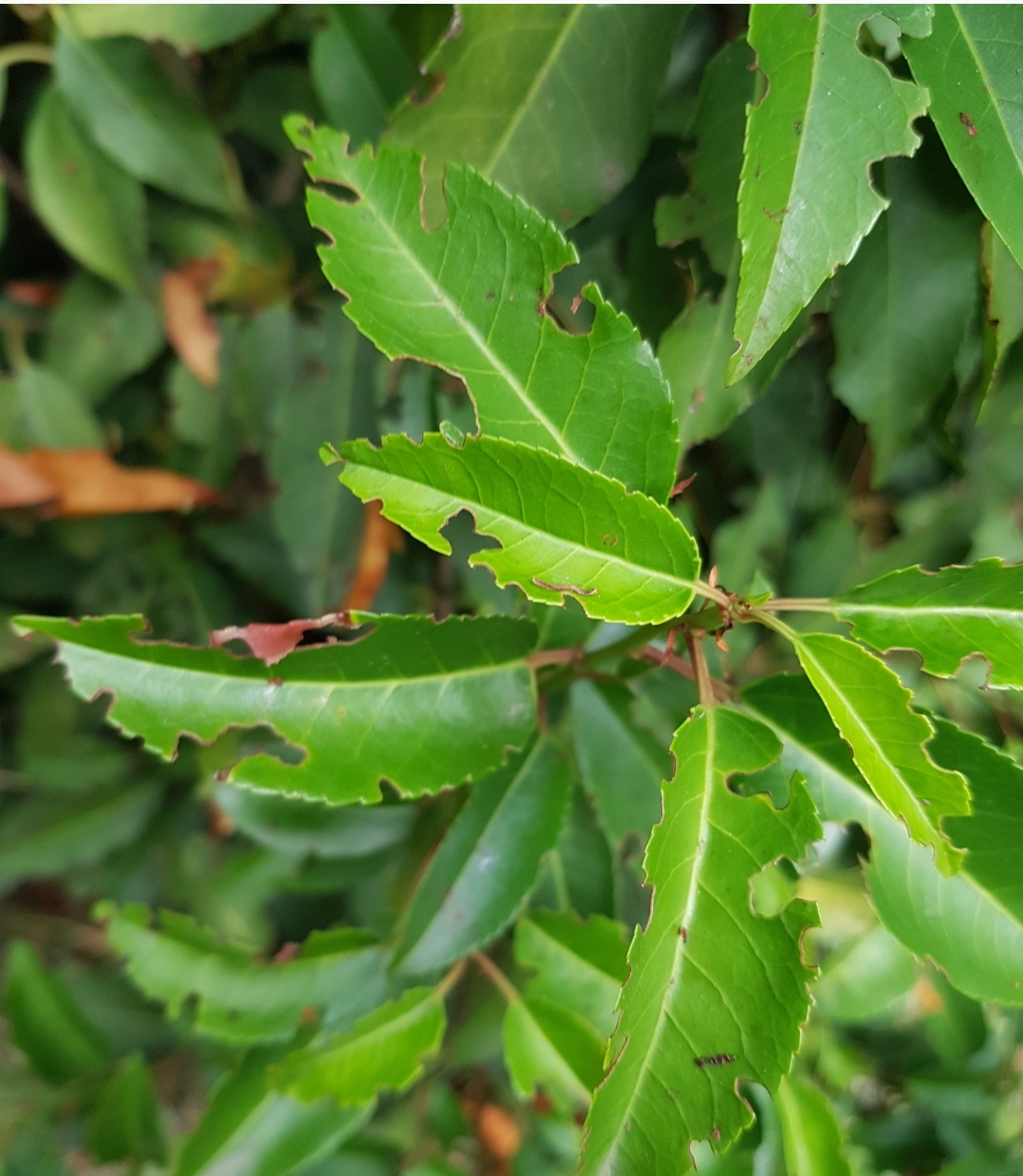 Jede meine Hecke aus portugiesischem Kirschloorbeer hat immer mehr Blätter mit Löchern/ausgestanzten Rändern, vor allem im unteren Teil der Pflanzen.