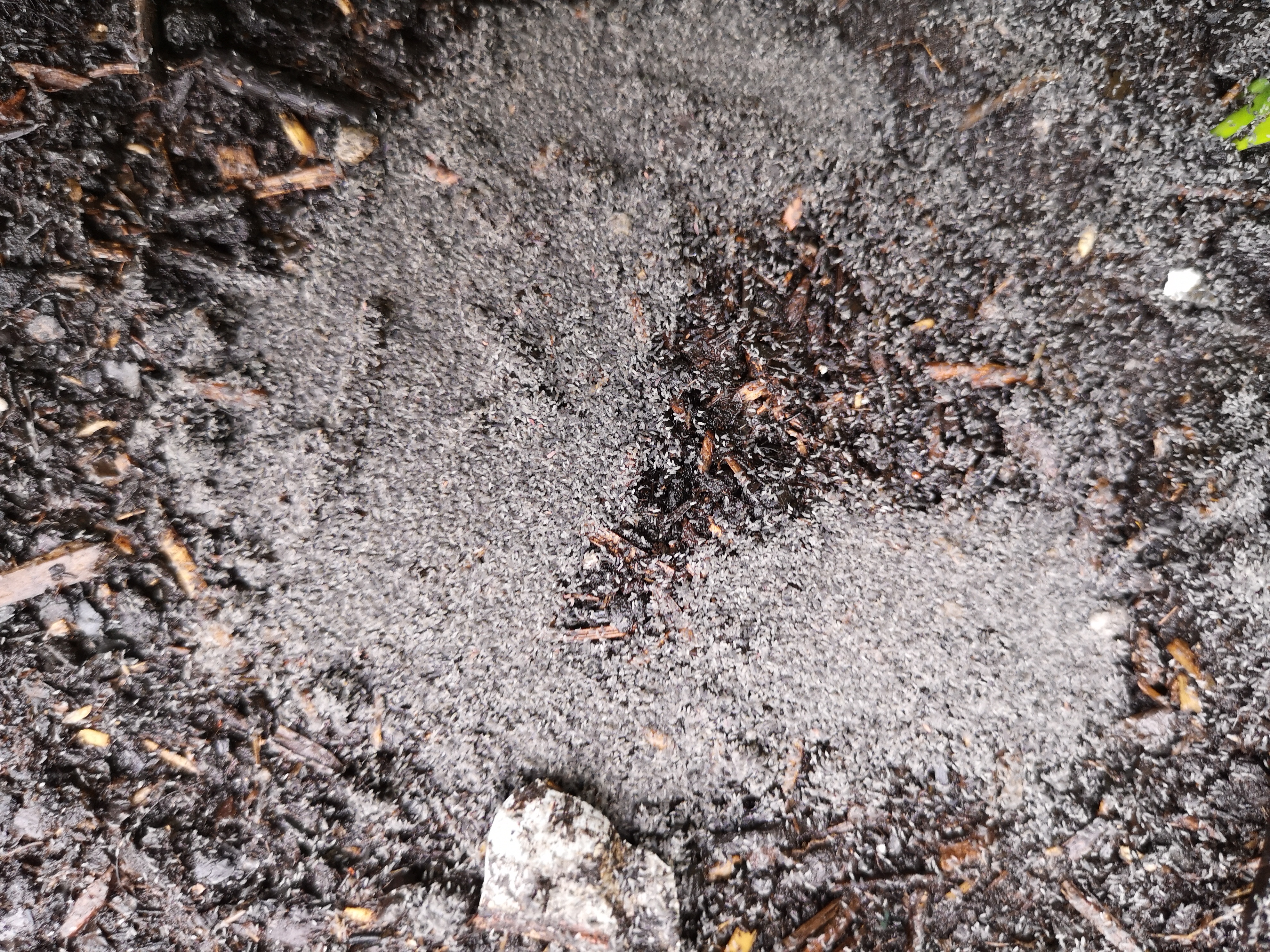 Auf der Erde vom Beet siedeln sich Kolonien von kleinen Tieren an. Die fliegen nicht weg, lassen sich zwar mit Wasser auseinandertreiben, danach formieren sie sich jedoch direkt neu. Sie sind recht regungslos. Kein springen, kein Fliegen, kein Laufen. Ich würde es als wimmeln bezeichnen.