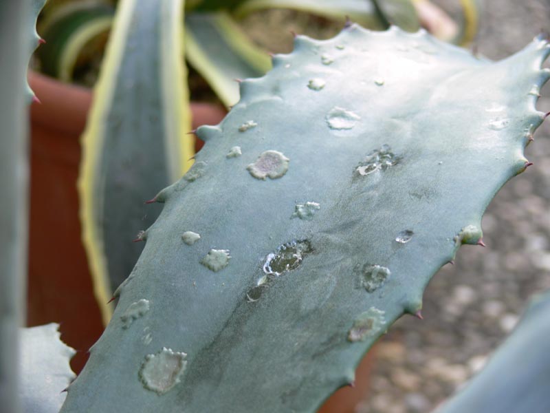 Hallo, Ich habe seit ein paar Tagen oder vielleicht zwei Wochen komische Flecken auf den Agavenblättern. Eine Art der Flecken ist glänzend und flach, manchmal auch kugelförmig. Es scheint, als ob jemand das Blatt anpiekst und der Saft austritt und dann antrocknet. Die anderen Flecken sind etwas erhaben, und in Blattfarbe, werden nach einiger Zeit dann innen braun. Ich hoffe,daß ich meine Bilder anhängen kann, dort ist es gut zu erkennen. Was kann das wohl sein?javascript:emoticon(':?')